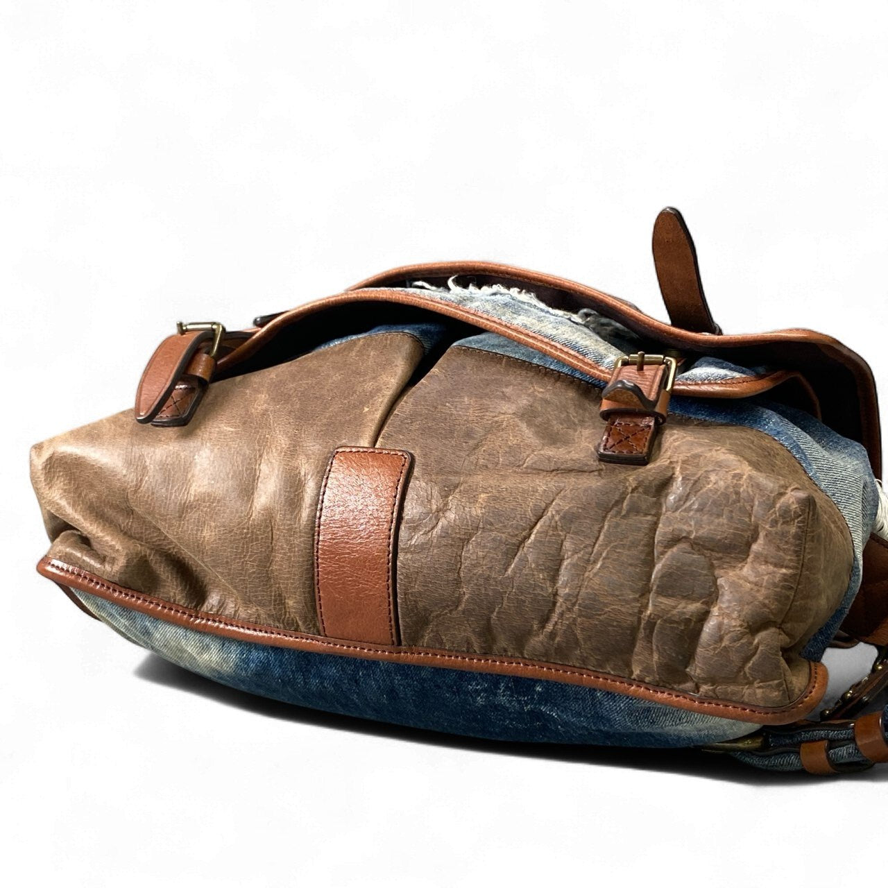 大胆なユーズド加工デニムとブラウンレザーのコンビが目を引く、D&Gらしい個性派ショルダーバッグです。ラフにほつれたダメージデニムがヴィンテージ感を演出し、レザーのパイピング・バックル金具が高級感をプラス。大判フラップで荷物をしっかり守りつつ、内部は大容量でデイリーから旅行まで幅広く活躍します。カジュアルスタイルの主役として存在感抜群で、コーデを一気にこなれさせてくれる一点物のようなデザインです。