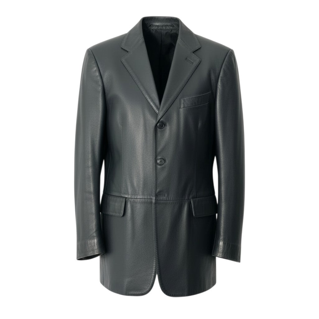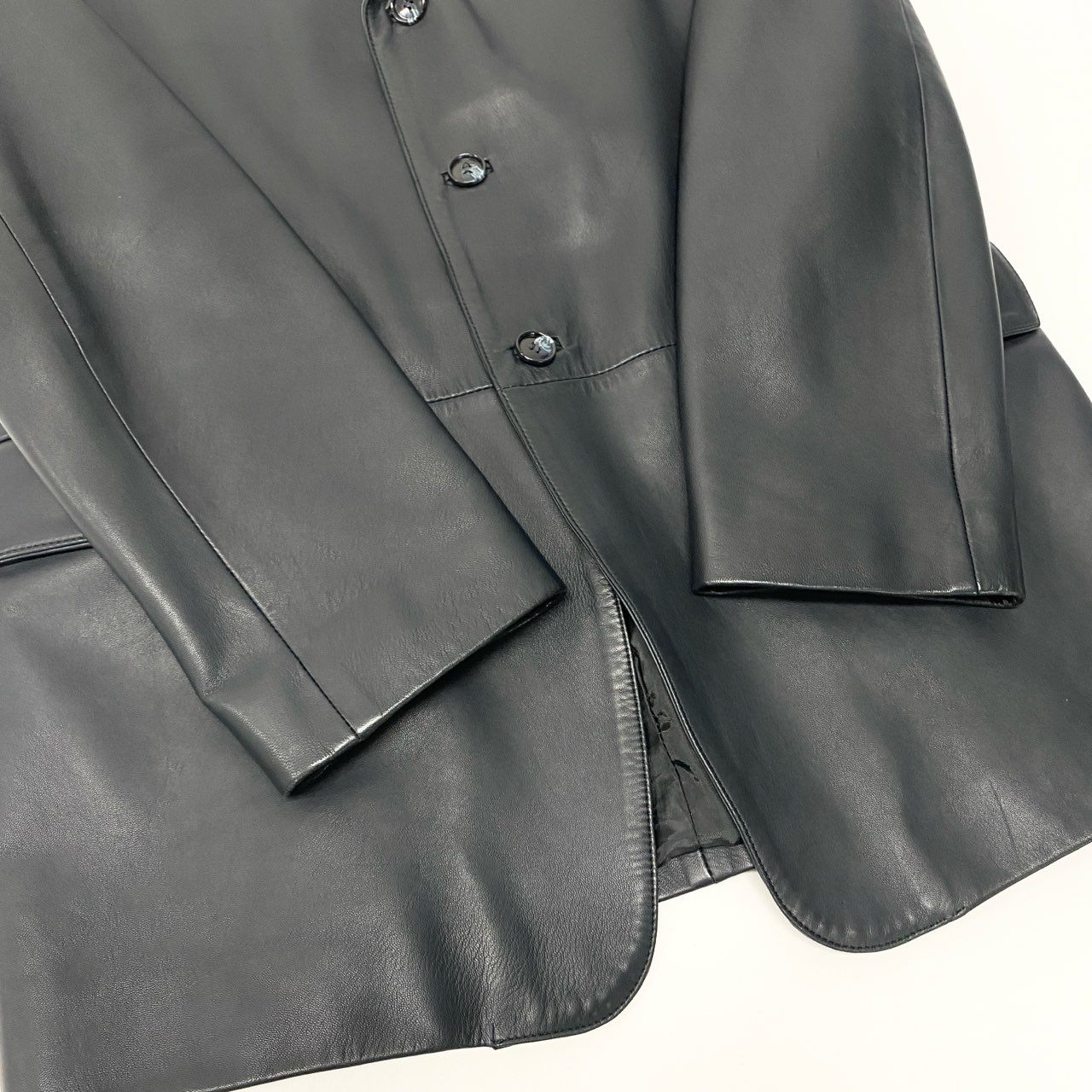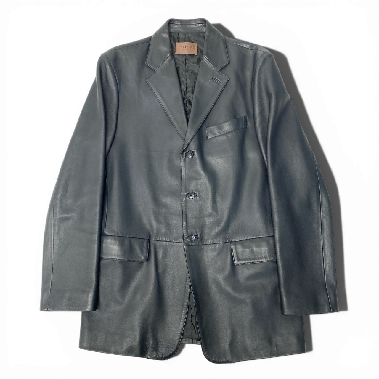 深みのあるブラックカラー無地レザーテーラードジャケットです。 上質でしなやかな光沢感のあるレザー素材が、LOEWEらしいラグジュアリーな雰囲気を演出します。 シングル3ボタン仕様とフラップポケットデザインで、クラシックかつ洗練された印象。 ヒップが隠れるロング丈のため、モードスタイルや秋冬のレイヤードコーデにも最適な一着です。