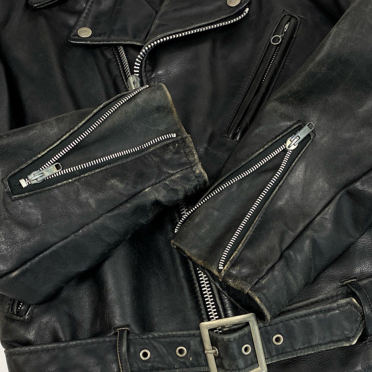 表記サイズ40、実寸は着丈61cm・肩幅46cm・身幅51cm・袖丈66cmで、身長170〜178cm前後の方で腰丈の王道ライダースバランスです。