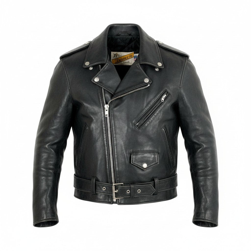 SCHOTTの名作ダブルライダース、HIROSHIMA GreenHillモデル。重厚感のあるブラックレザーに、フロントは王道のダブル仕様と無骨なメタルパーツを備えたクラシックデザインです。背面には「Green Hill / HIROSHIMA」の大型刺繍パッチが配され、グリーンのトカゲモチーフが強烈な存在感を放ちます。プリントではなく厚みのある刺繍仕様で、ヴィンテージらしい経年感と相まって一点モノ級の迫力。バイカーはもちろん、コレクターや古着好きに刺さる主役級ライダースです。