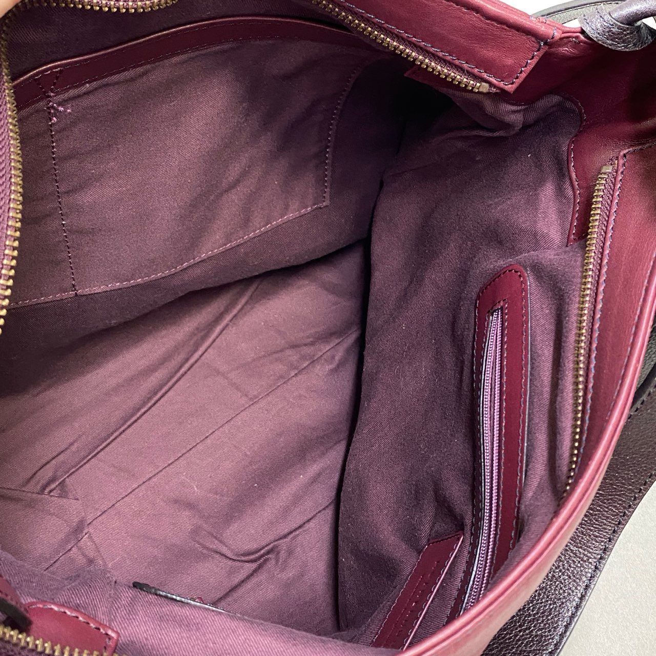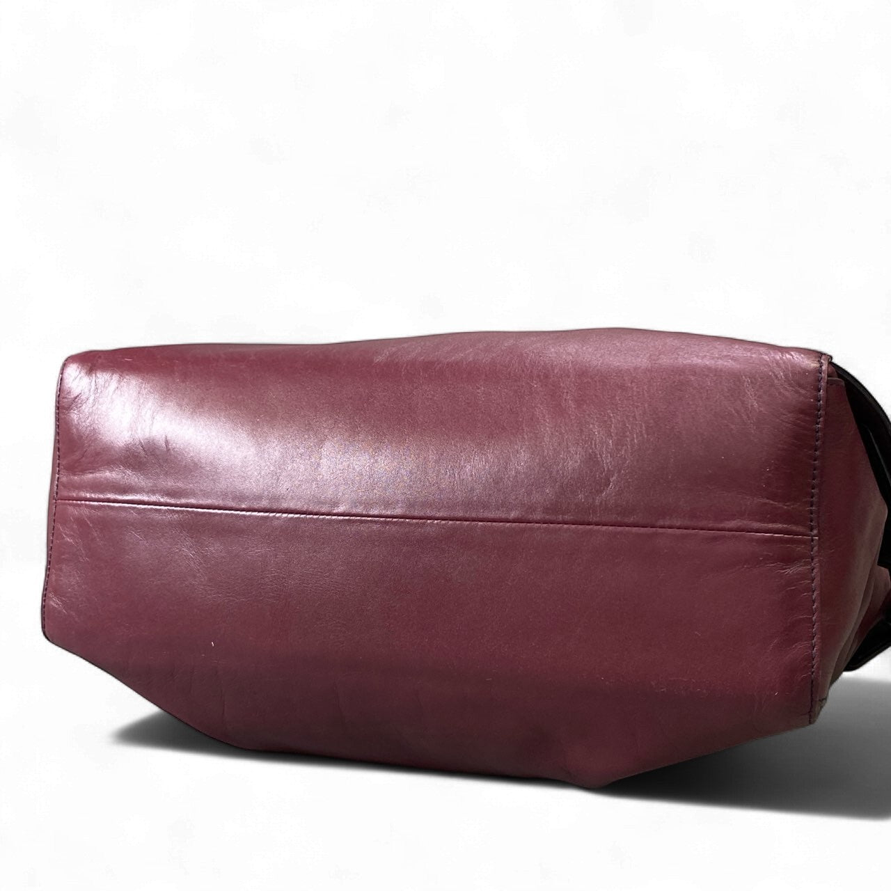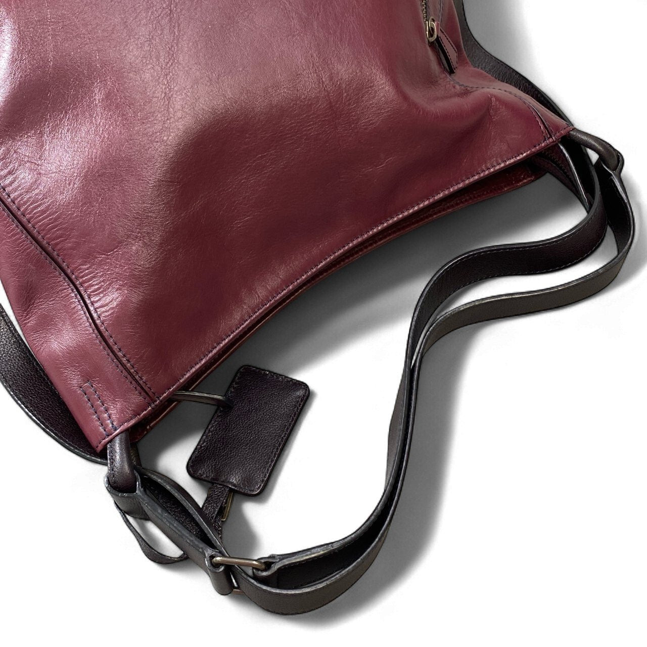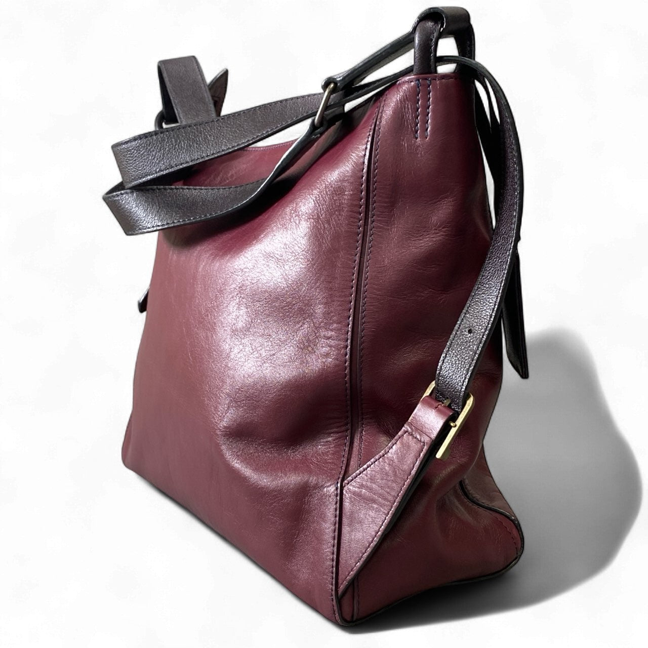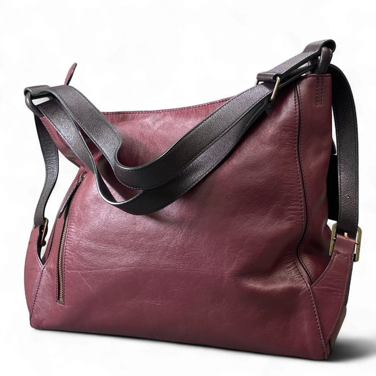 深みのあるワインレッド(ボルドー)カラーが美しい、MOTHERHOUSE の上質レザーショルダーバッグです。なめらかな光沢を帯びたレザーは自然なシワ感が魅力で、使い込むほど風合いが増す表情豊かな素材です。ブラックのショルダーストラップとのツートーンが上品で、カジュアルからきれいめコーデまで幅広くマッチします。大容量ながら柔らかいフォルムで身体にフィットし、通勤・お出かけ・旅行にも使いやすい万能バッグです。普段使いに上品さをプラスしたい方におすすめの一品です。