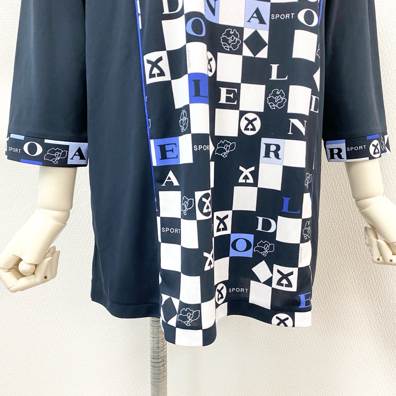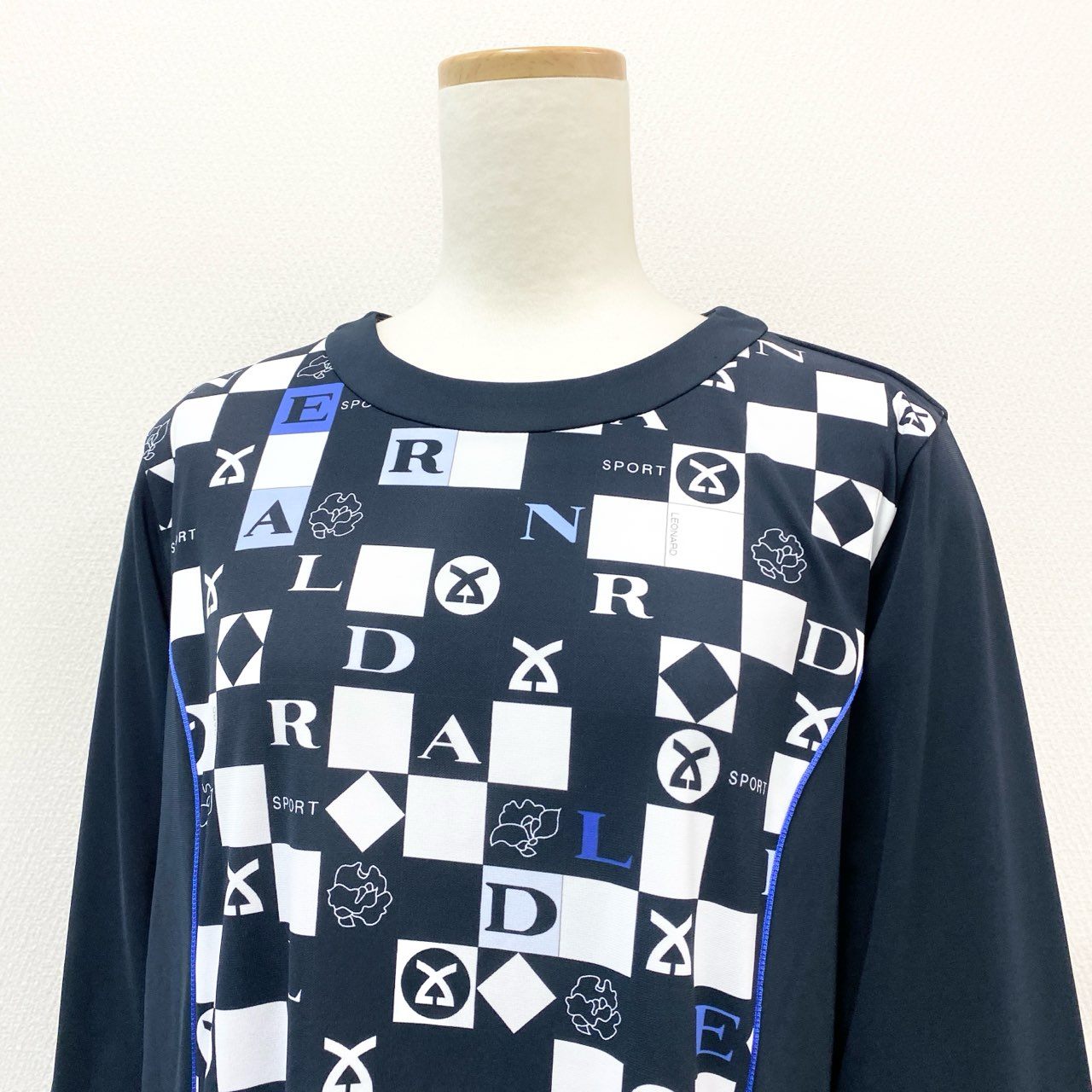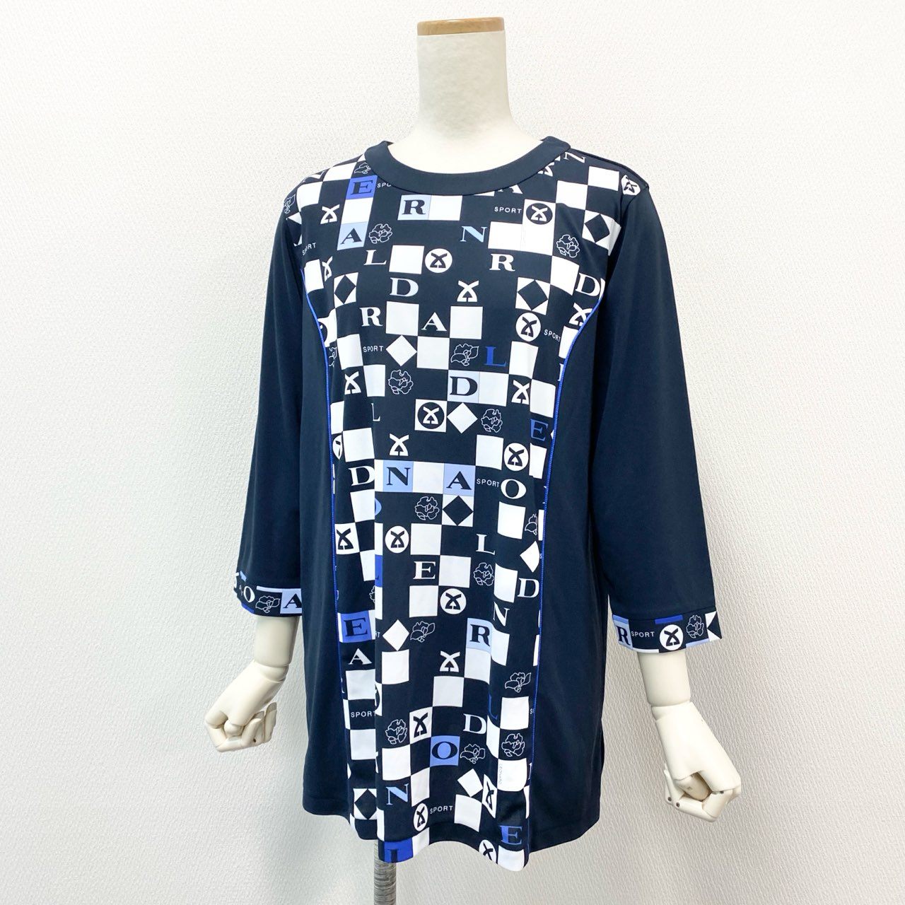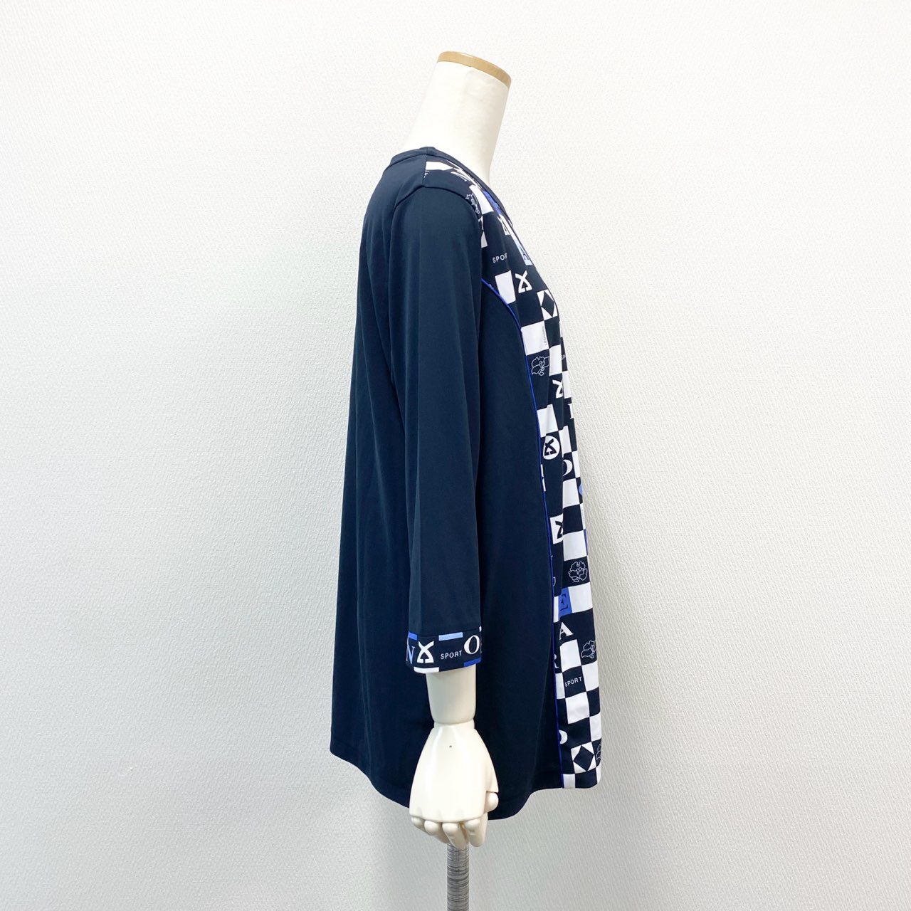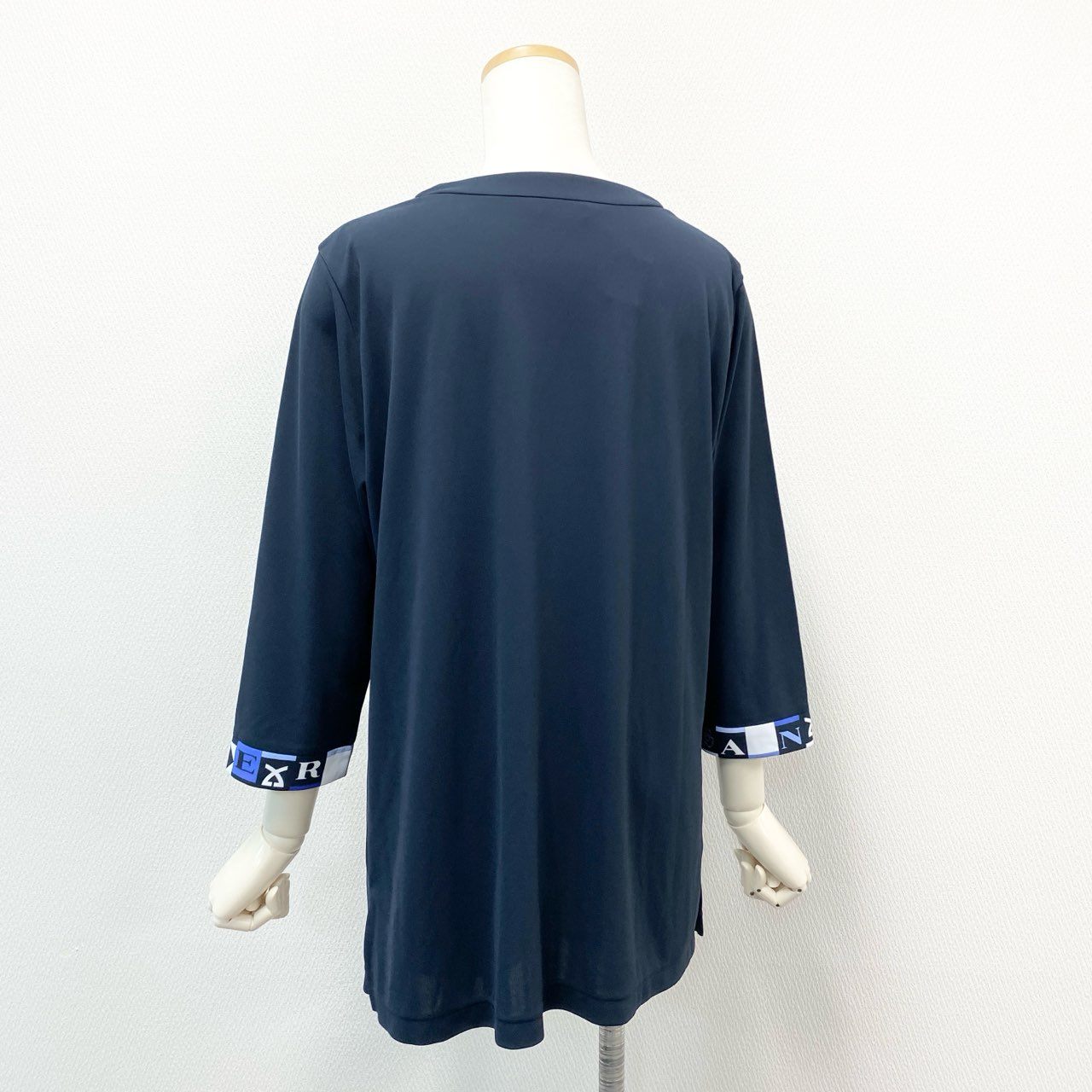 67g21-2 《美品》 LEONARD レオナール 7分袖チュニック ブラウス トップス ロゴプリント 手洗い可能 サイズ42 ダークネイビー ポリエステル レディース 日本製