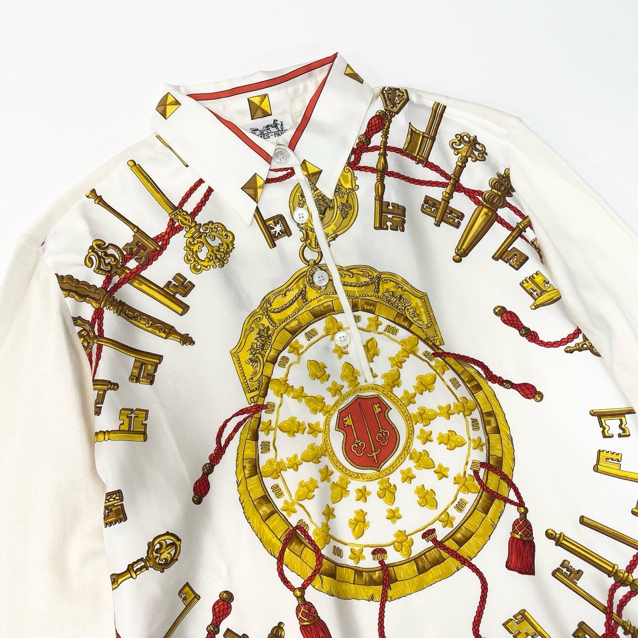 Ia29 HERMES エルメス 長袖シャツ 長袖ニットセーター 異素材切替 スカーフ柄 シルク100% イタリア製 Sサイズ ホワイト レディースo07t
