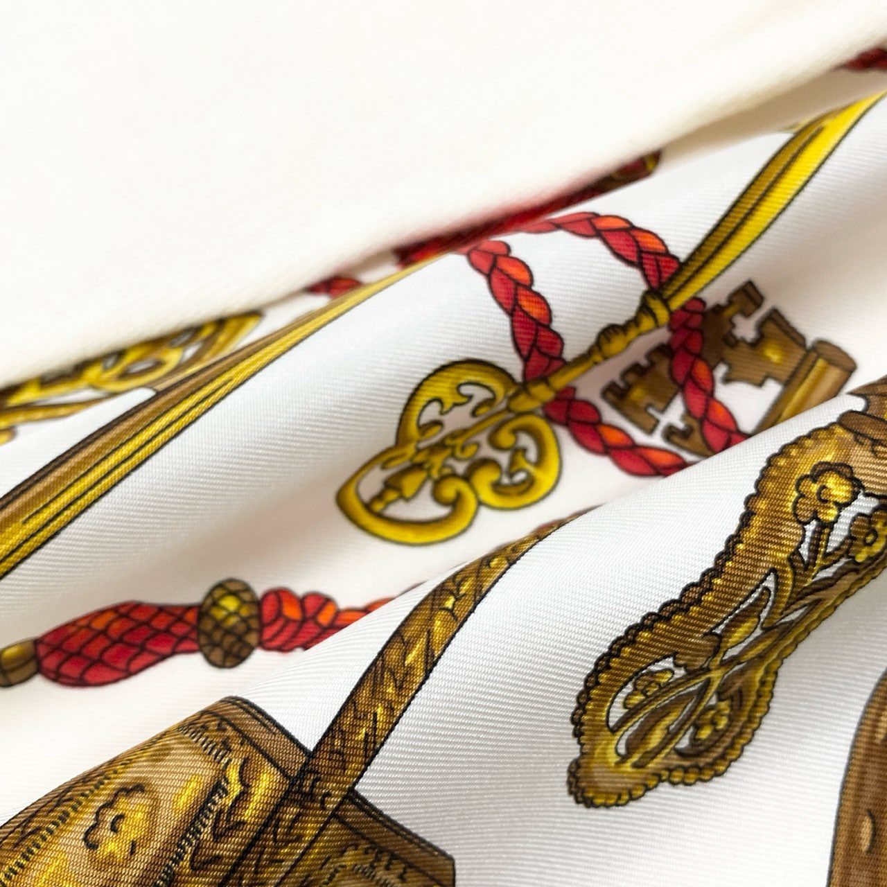 ホワイトをベースに、鍵や装飾モチーフを配したエルメスらしいスカーフ柄が印象的なニットトップスです。シルク100%素材ならではのなめらかな肌触りと、ほんのりとした光沢感が上品さを引き立てます。無地部分との異素材切替により、主張がありながらも落ち着いたバランスに仕上がっています。きれいめスタイルはもちろん、シンプルなボトムと合わせるだけでコーディネートの主役になる一着です。