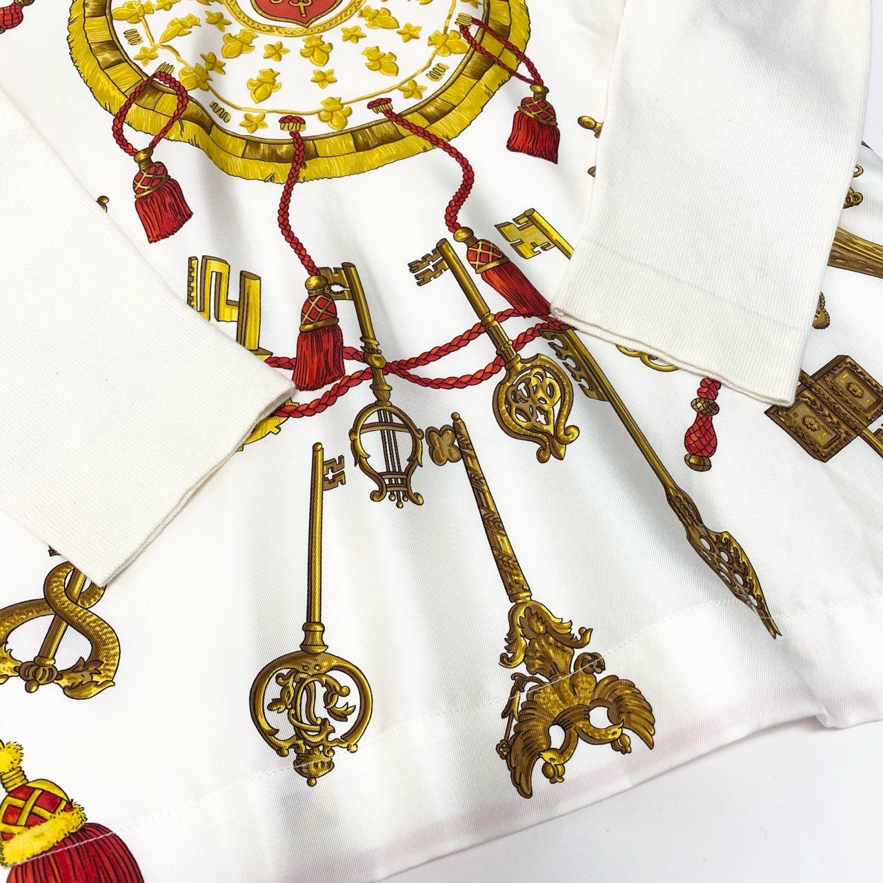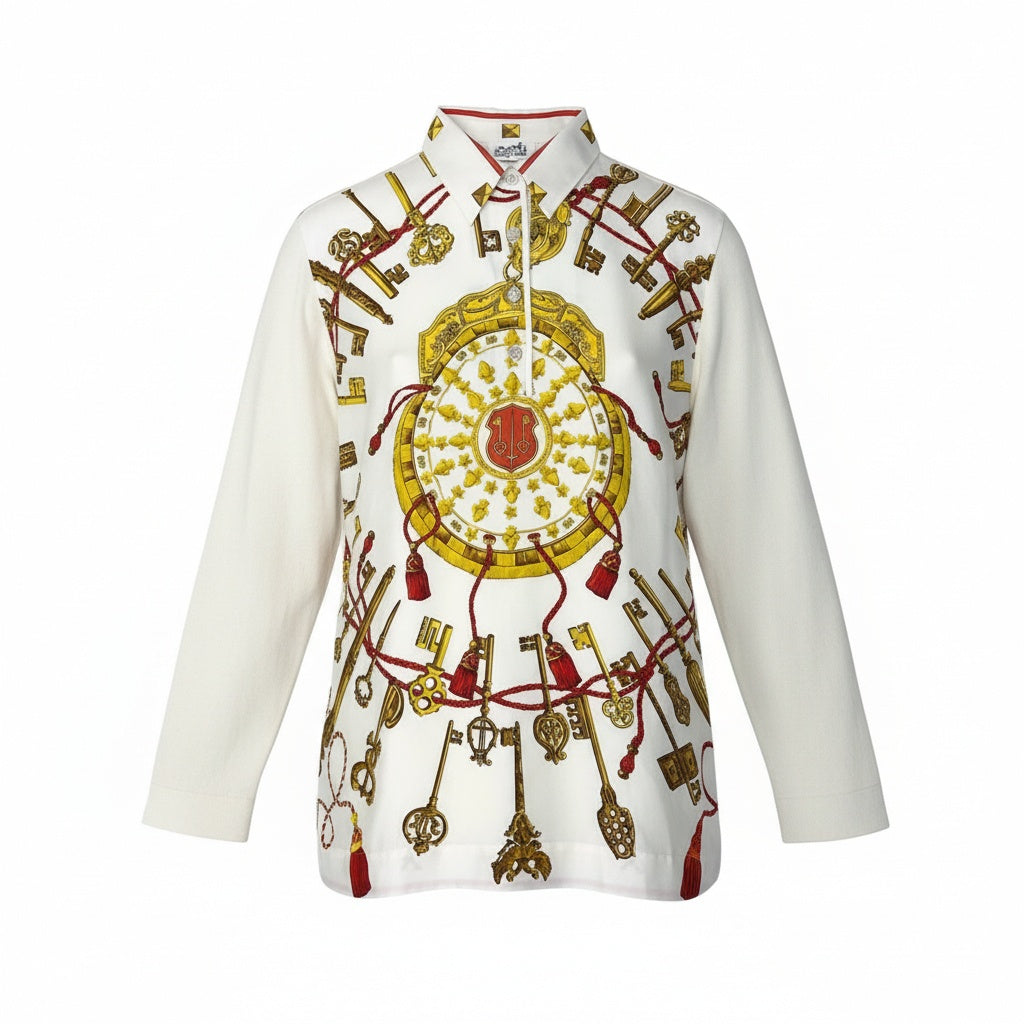 ホワイトをベースに、鍵や装飾モチーフを配したエルメスらしいスカーフ柄が印象的なニットトップスです。シルク100%素材ならではのなめらかな肌触りと、ほんのりとした光沢感が上品さを引き立てます。無地部分との異素材切替により、主張がありながらも落ち着いたバランスに仕上がっています。きれいめスタイルはもちろん、シンプルなボトムと合わせるだけでコーディネートの主役になる一着です。