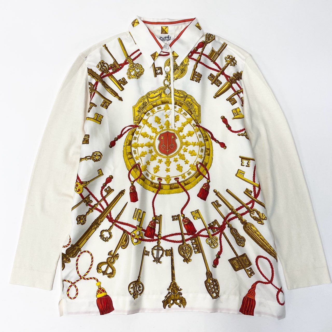87a29 HERMES エルメス 長袖シャツ 長袖ニットセーター 異素材切替 スカーフ柄 シルク100% イタリア製 Sサイズ ホワイト レディースo07t