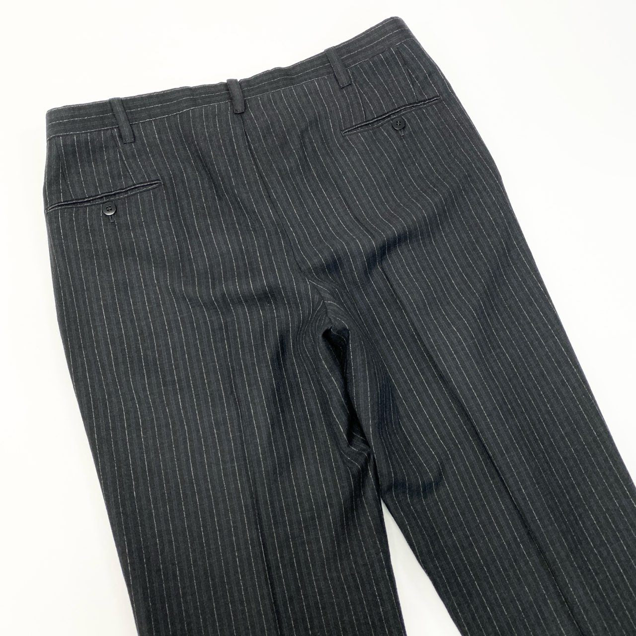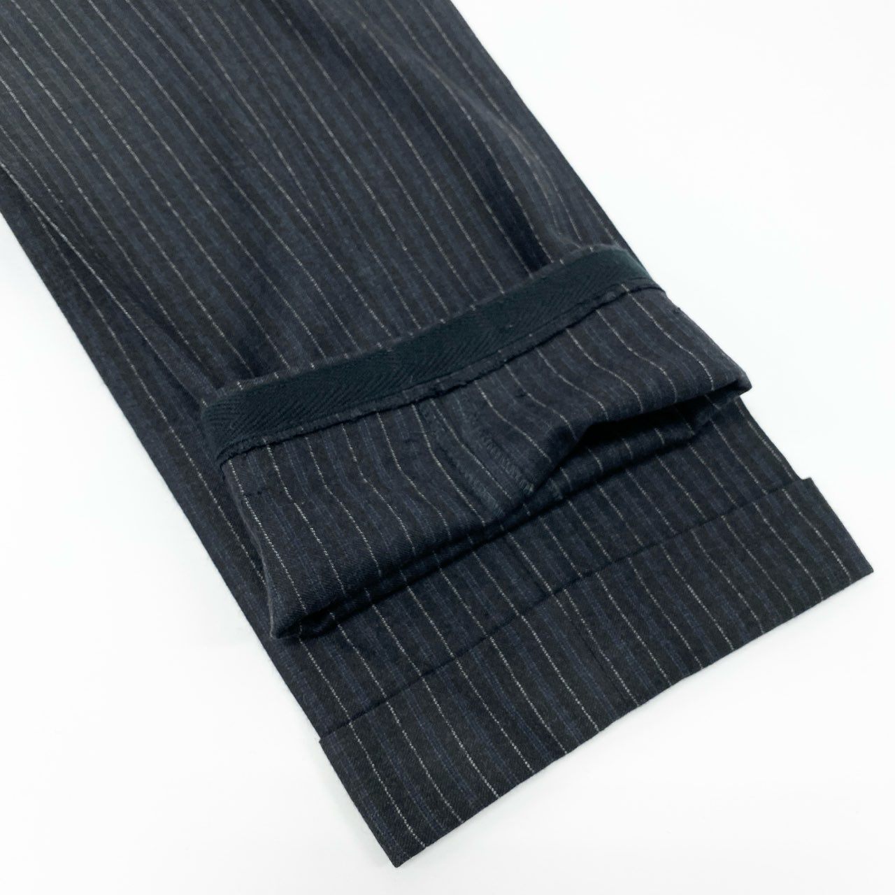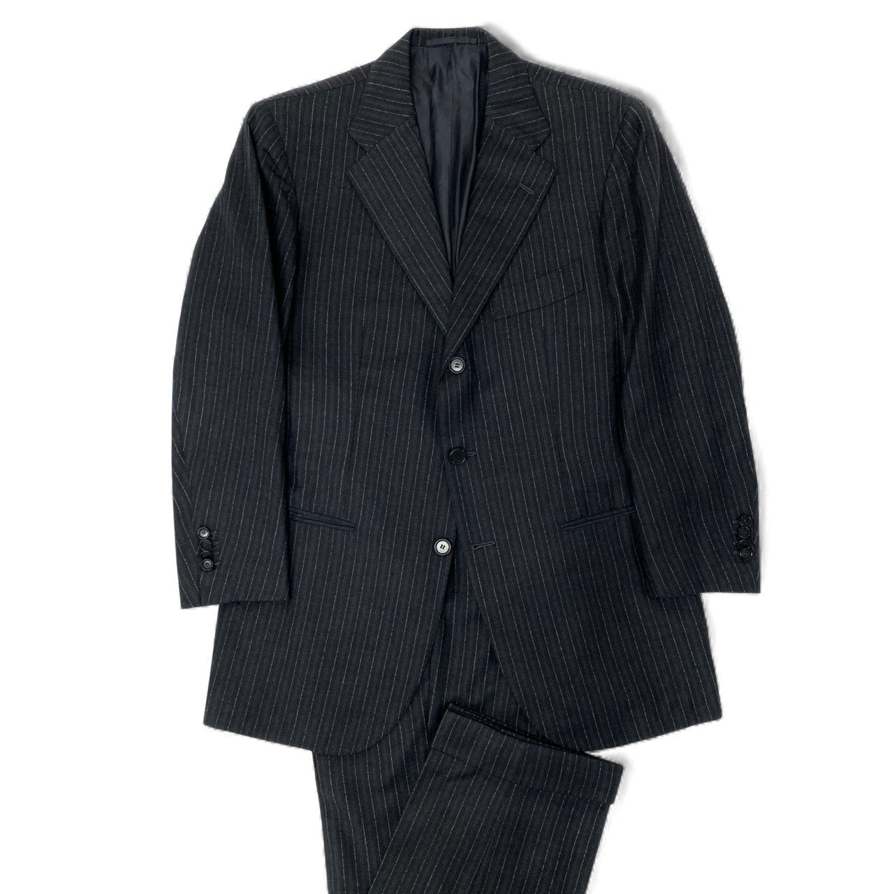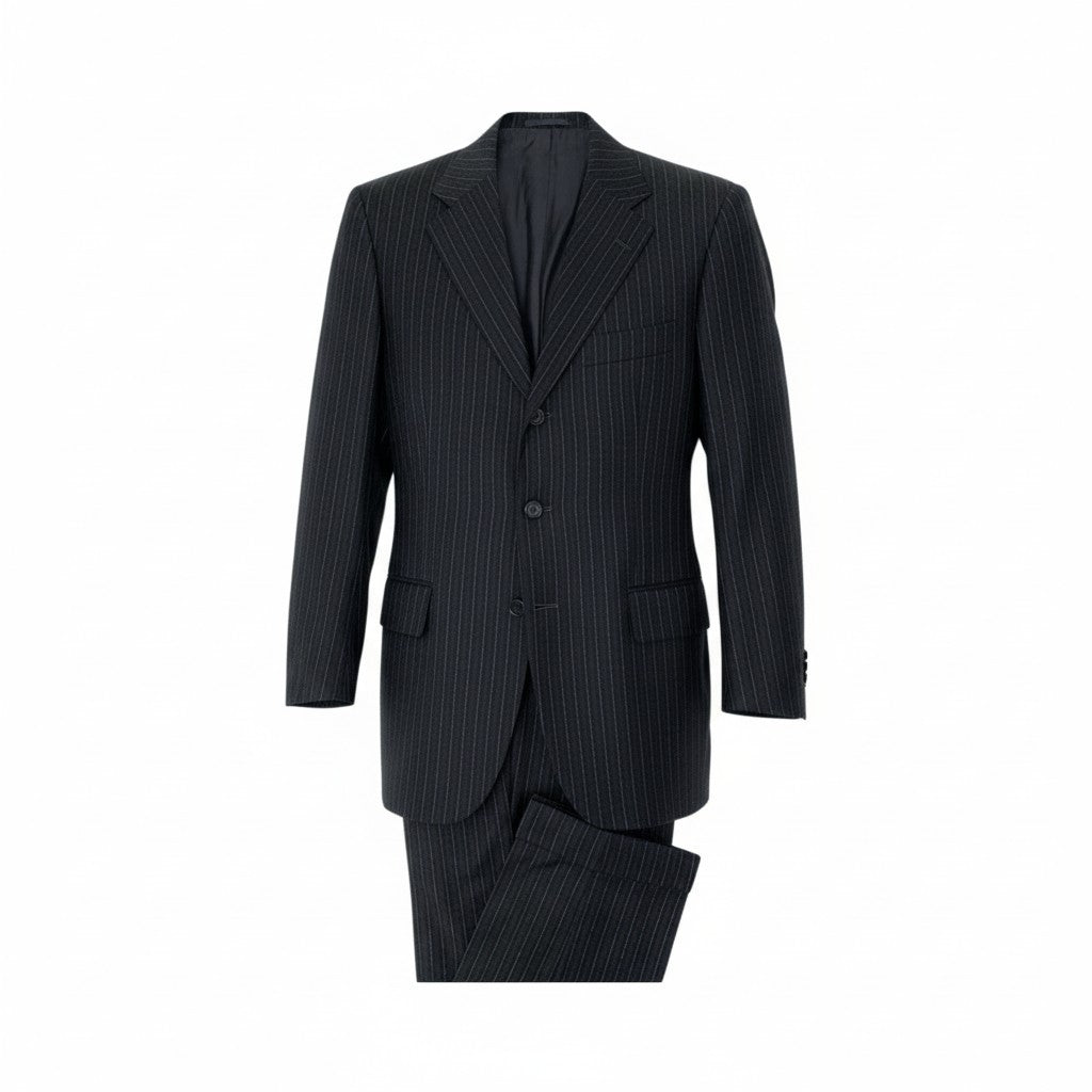 深みのあるブラック×ネイビー×グレーのストライプが上品に映える、Cesare Attolini(チェザレ アットリーニ)の高級セットアップスーツです。イタリア名門「Tie Your Tie」取り扱いラインらしい、美しいラペルロールと立体的な肩の作りが特徴。ウール素材はしなやかな手触りで、軽さと着心地の良さを兼ね備えています。ジャケットは洗練された3ボタン段返り、パンツは端正なストレートシルエットで、ビジネスにもフォーマルにも活躍。長く愛用できるワンランク上のスーツです。