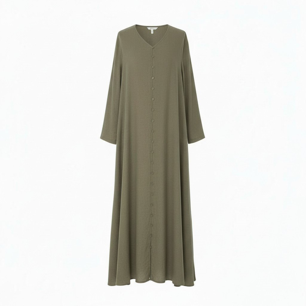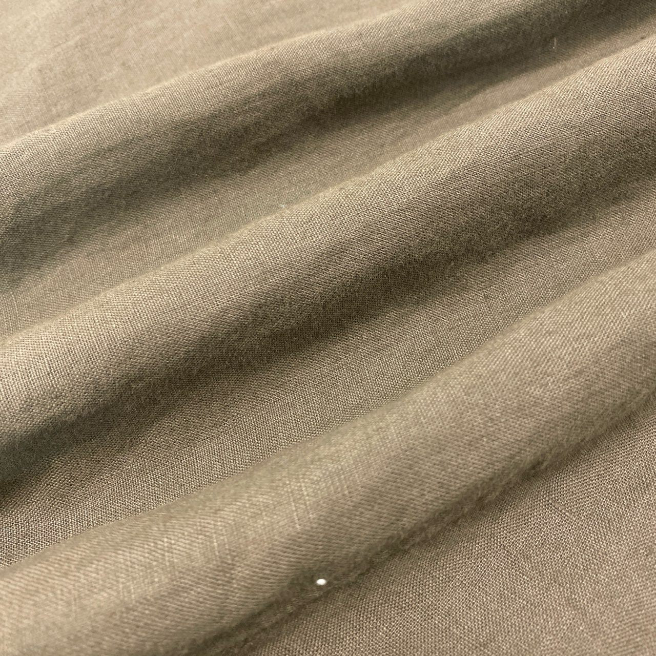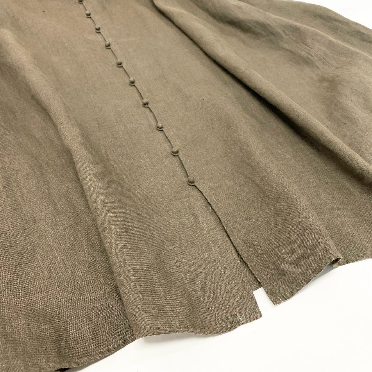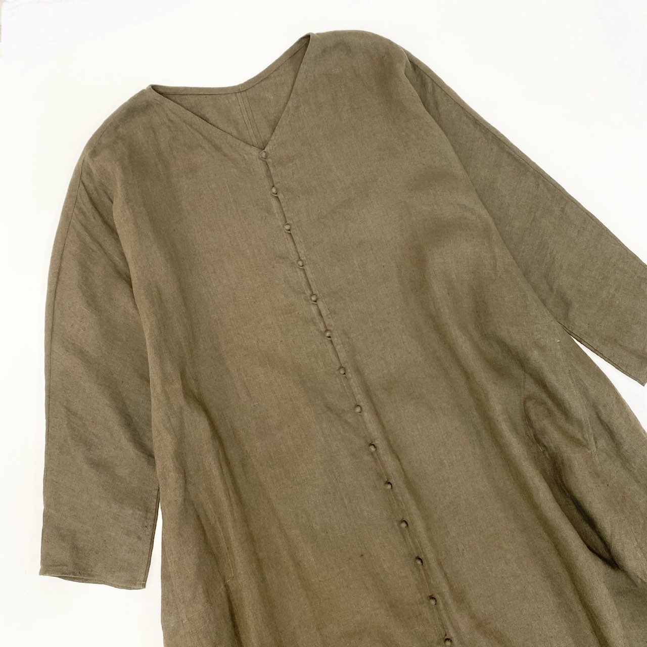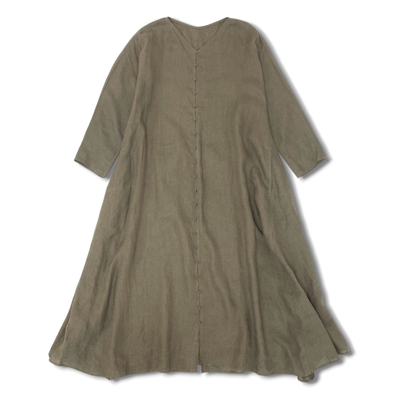 落ち着いたカーキグリーンが美しい、JURGEN LEHL(ヨーガンレール)の長袖リネンロングワンピースです。表情のあるマットなリネン素材が自然なドレープを生み、動きに合わせて柔らかく揺れる上品な仕上がり。フロントには同色のくるみボタンが縦に並び、シンプルながらも存在感のあるデザインです。ゆったりしたAラインシルエットで体のラインを拾わず、着心地も快適。ナチュラルスタイルはもちろん、羽織りとしても使える万能な一着です。