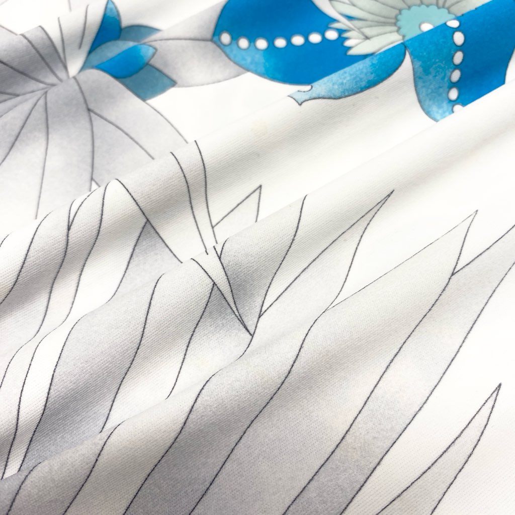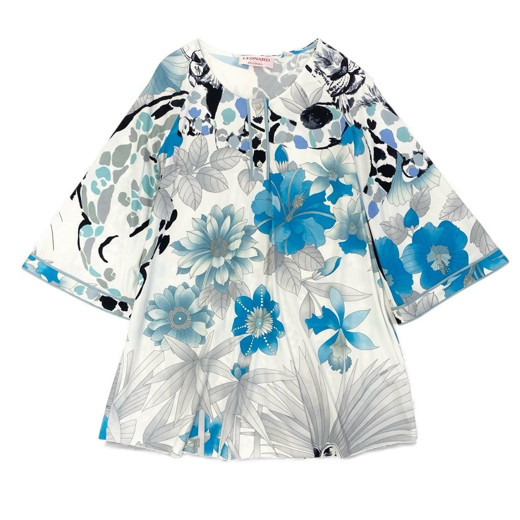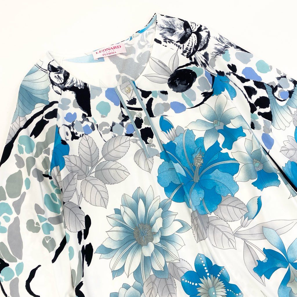 69L17 LEONARD レオナール チュニック ロングスリーブカットソー 美しい花柄プリント ストレッチ素材 トップス 36サイズ ホワイト ブルー レディースo07t