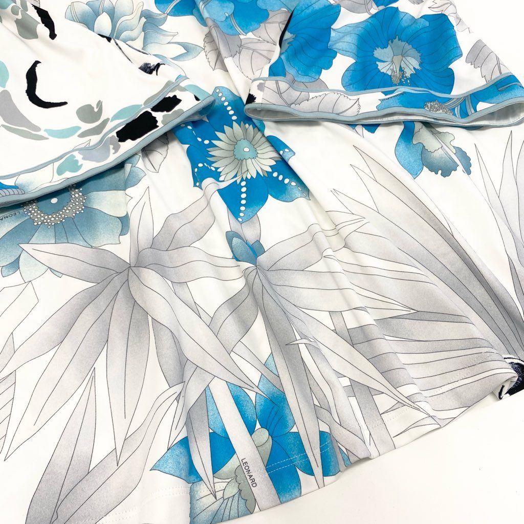 LEONARD(レオナール)らしい、ホワイトベース×ターコイズブルー系を基調とした華やかなフラワープリントのカットソーです。大胆ながらも上品な花柄とリーフモチーフが印象的で、コーディネートの主役になります。素材はなめらかで伸縮性のあるストレッチ生地を使用し、快適な着心地を実現。ヒップが隠れる丈感でパンツとも相性が良く、きれいめカジュアルからお出かけスタイルまで活躍する一着です。
