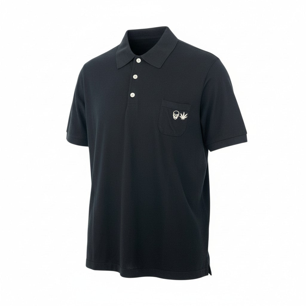 深みのあるブラックカラーで、柄のない無地デザインの半袖ニットポロシャツです。素材はマットな質感のニットで、落ち着いた高級感があります。胸ポケットにはスカルとリーフモチーフの刺繍が施され、lucien pellat-finetらしい遊び心のあるアクセントになっています。1枚で主役になるデザインのため、デニムやスラックスと合わせて大人のカジュアルやリゾートスタイルにもおすすめです。