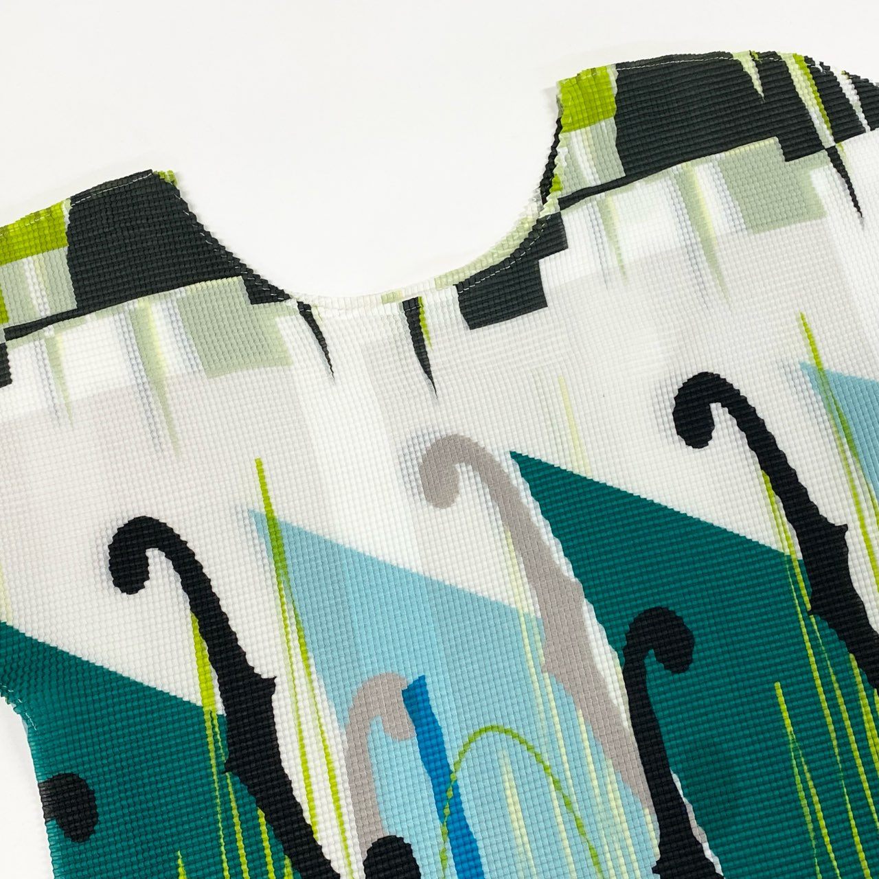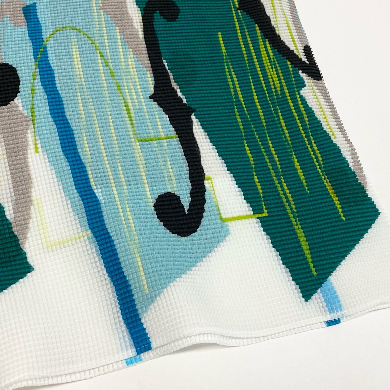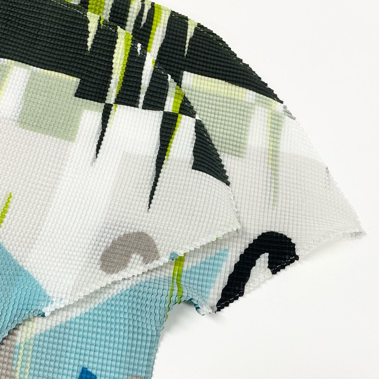 ホワイトベースにエメラルドグリーン、ターコイズブルー、ブラック、グレーを組み合わせたジオメトリック総柄デザインです。細かなプリーツによるワッフル調の立体感ある素材で、軽やかで伸縮性に優れています。大胆な曲線モチーフと幾何学柄が目を引くアート性の高い一着。コンパクト丈でスタイルアップ効果もあり、シンプルなボトムと合わせるだけでモード感のあるコーディネートが完成します。イッセイミヤケらしい機能美とデザイン性を兼ね備えたアイテムです。