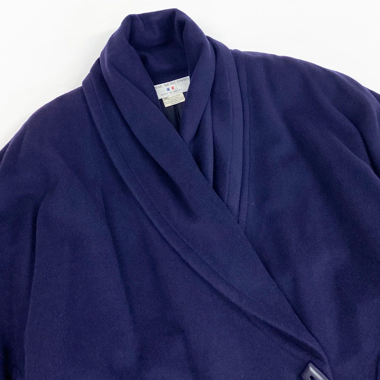 Vintage HANAE MORI PARISらしいエレガントさが際立つ、大判カラーコートです。深みのあるダークパープル系カラーに、マットで滑らかなカシミヤ混ウール素材を使用し、上品で落ち着いた印象に仕上げられています。大きく包み込むようなショールカラーと、身体をゆったり覆うシルエットが特徴。クラシックな装いからモード寄りのスタイリングまで対応し、冬のお出かけやきれいめシーンに映える一着です。