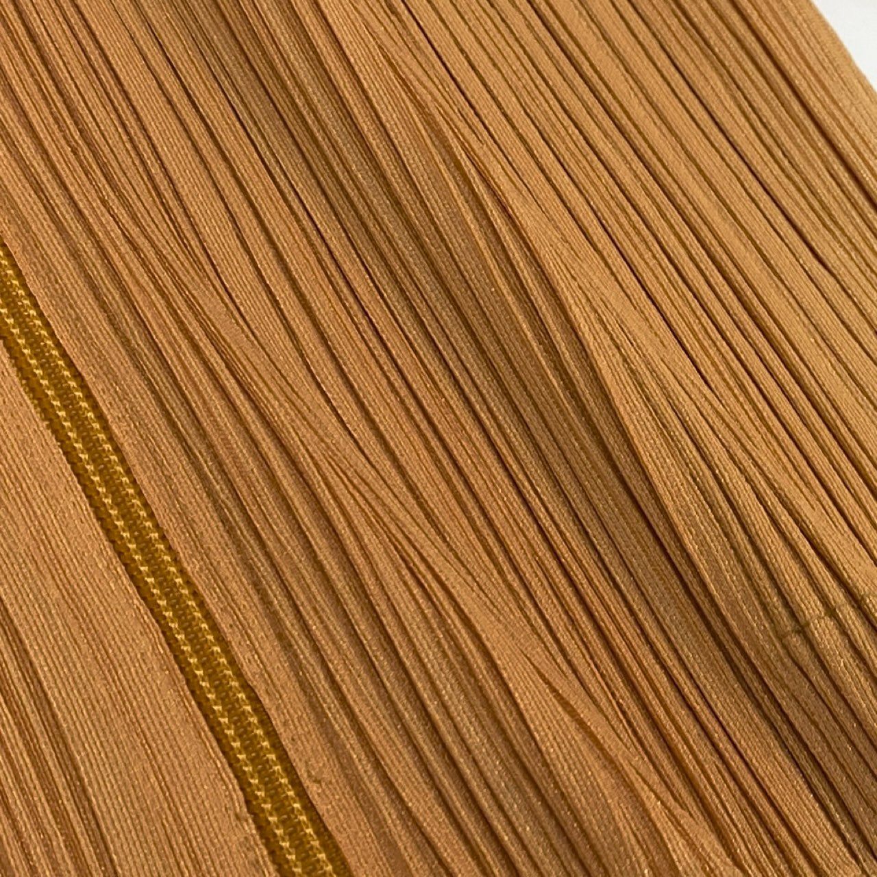 PLEATS PLEASE ISSEY MIYAKE(プリーツプリーズ イッセイミヤケ)のプリーツジャケット「PP91-JD081」。写真からはオレンジ寄りのベージュトーンで、縦方向の細かなプリーツ加工が立体感と伸縮性を与えています。素材は光沢のあるポリエステルプリーツで、軽量かつシワになりにくい機能性が魅力。ヒップを覆うチュニック丈デザインで、パンツスタイルにもスカートにも好相性。デイリーからオフィス、旅行まで幅広く活躍する一着です。