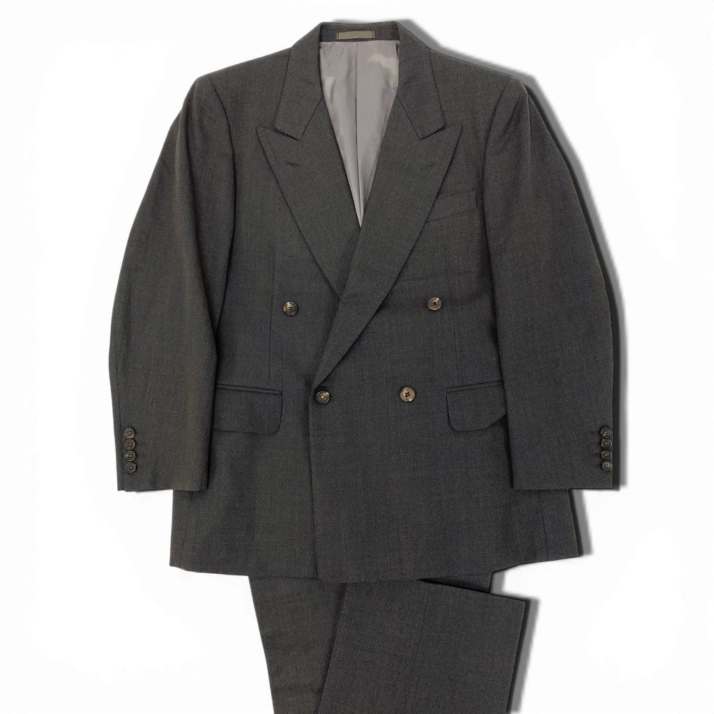 落ち着いたブラウン系カラーのスーツセットアップで、無地調(織り感のあるプレーン)の上品な表情が特徴です。素材はマットなウール系生地で、シーズンを問わず着用しやすい質感。ダブルブレスト仕様のメタル調ボタンがクラシックかつ重厚感のある印象を演出します。ビジネスシーンはもちろん、式典やフォーマルな場にも対応できる一着です。