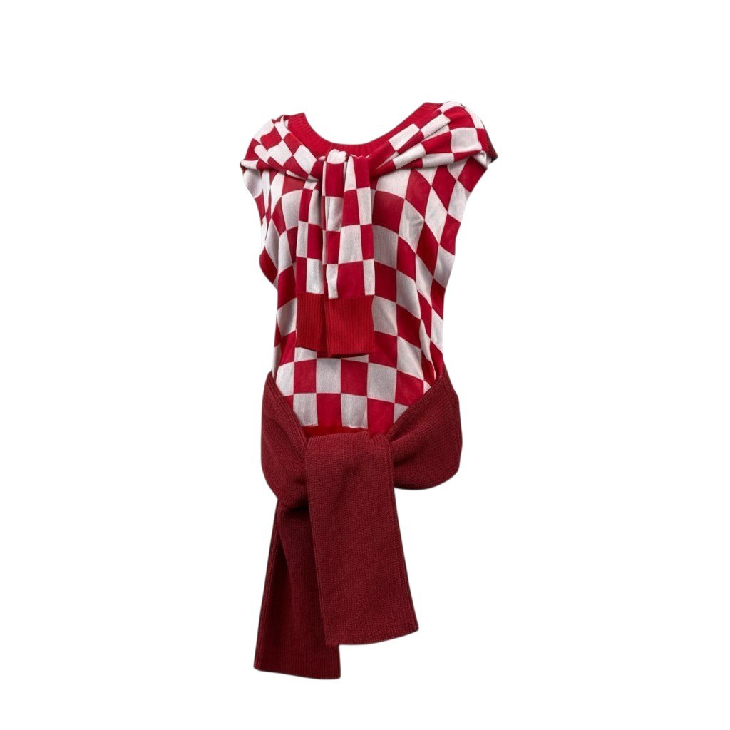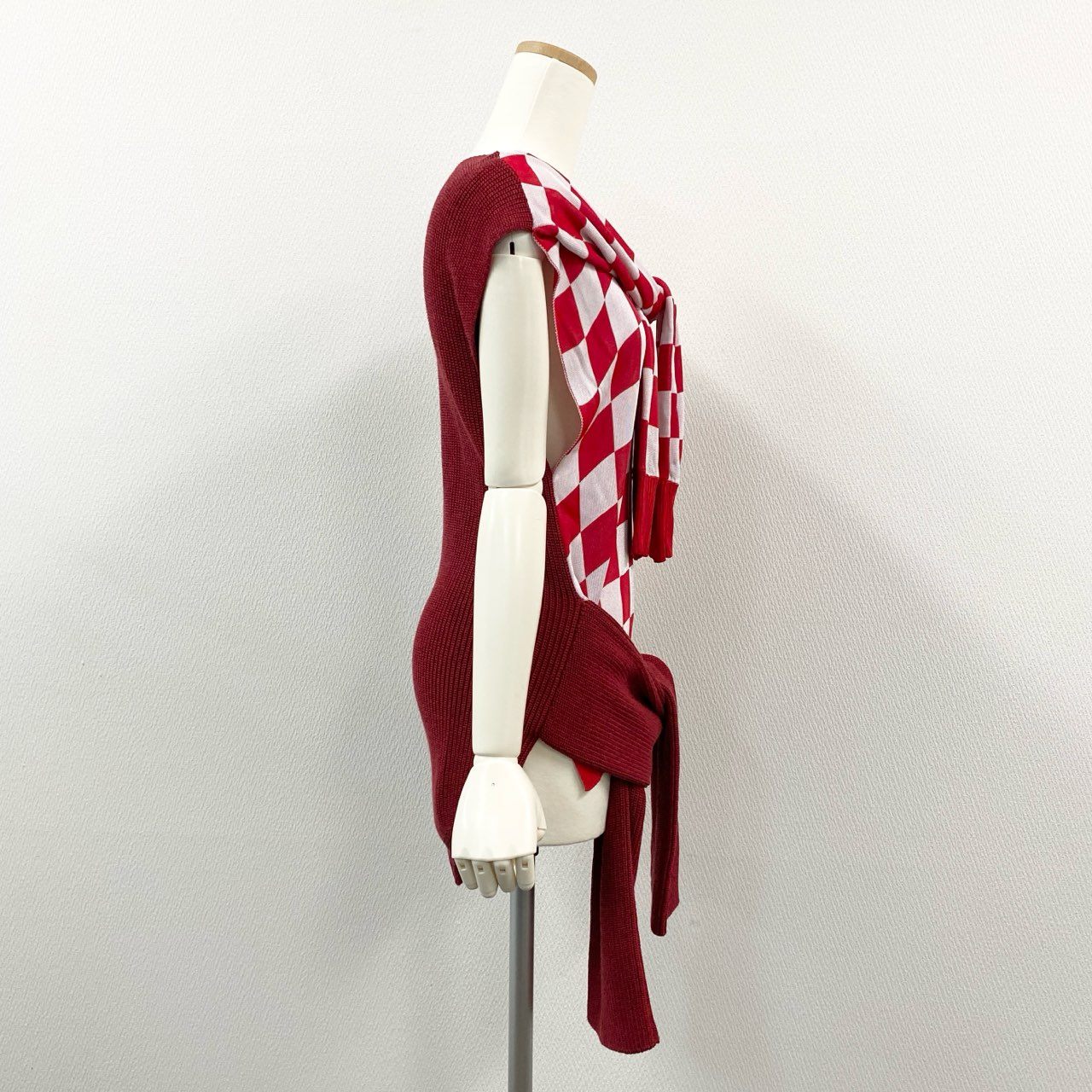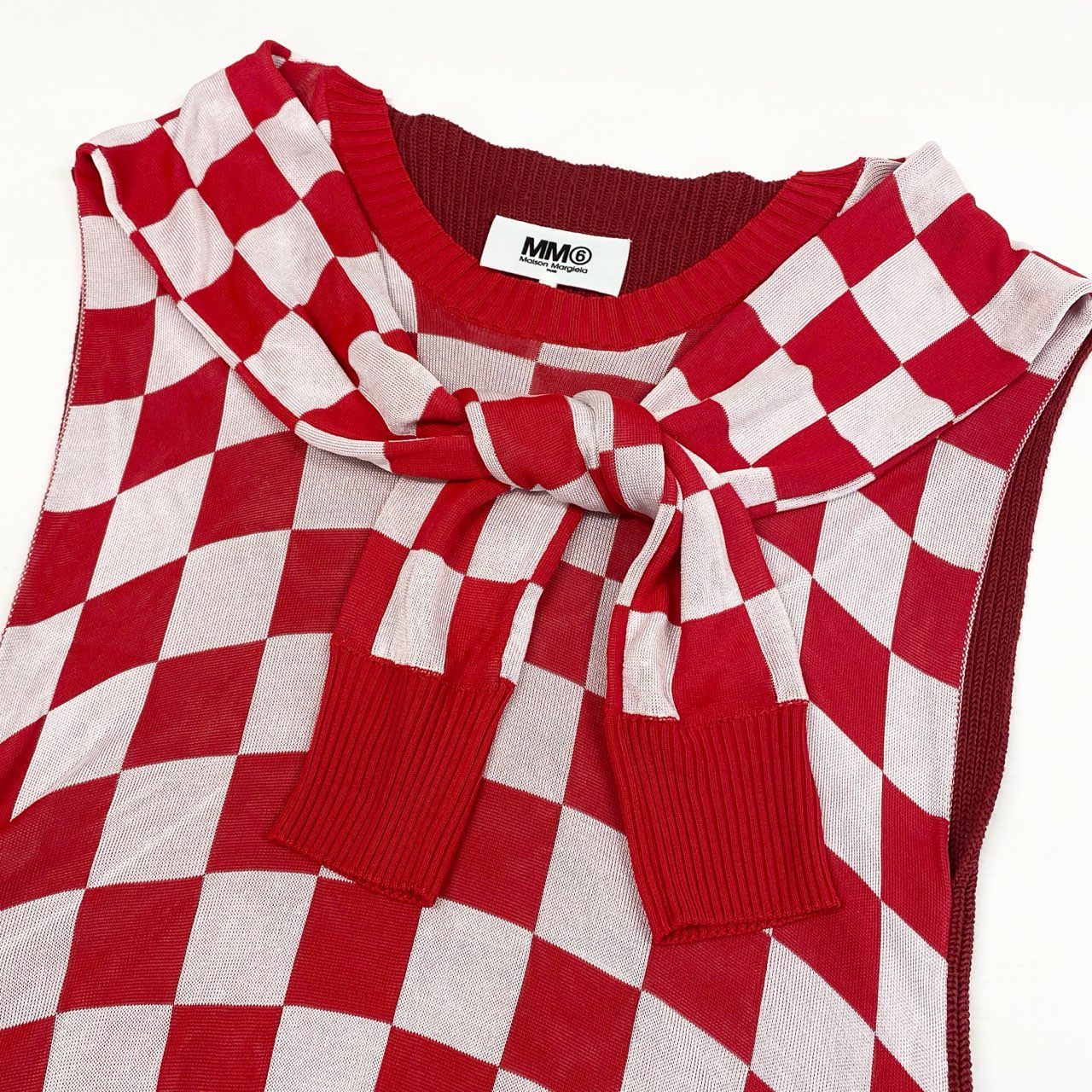 鮮やかなレッド×ホワイトのフラッグチェック柄が印象的なMM6の変形ニットトップスです。柔らかなニット素材で、ドレープ感のある立体的なデザインが特徴的な一着です。首元にはリブ編みのディテールが施され、付属のニットパーツを巻くような独創的な変形デザインがブランドらしいモード感を演出します。デニムやスラックスと合わせるだけで、コーディネートの主役になるアート感のあるスタイルを楽しめます。