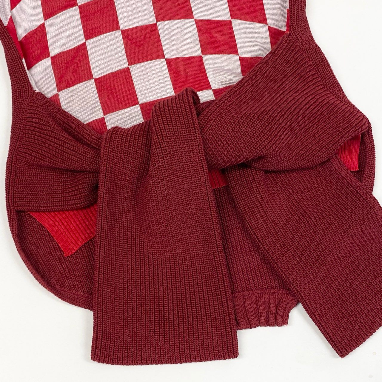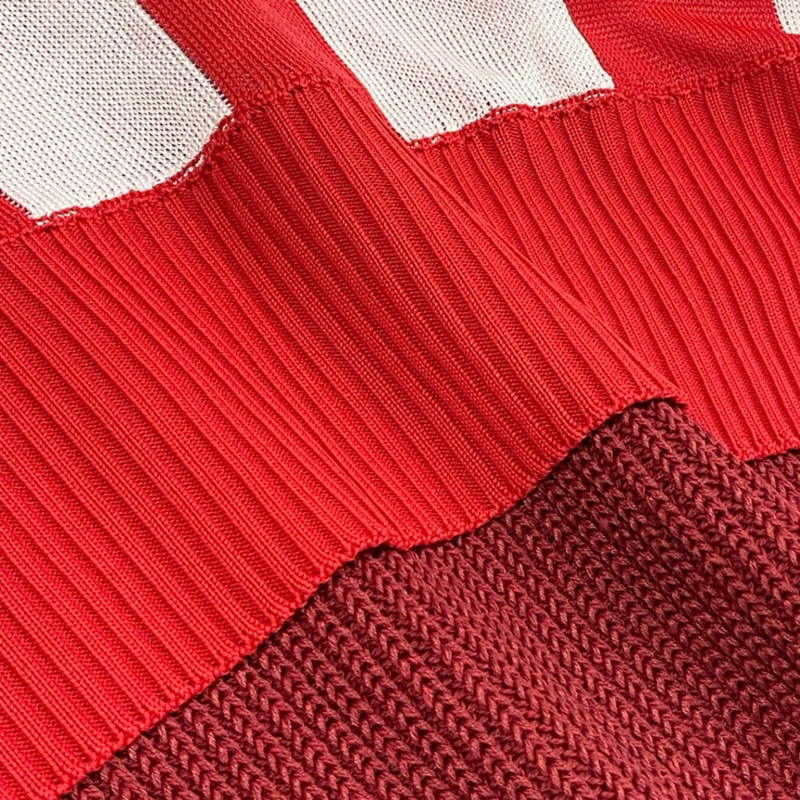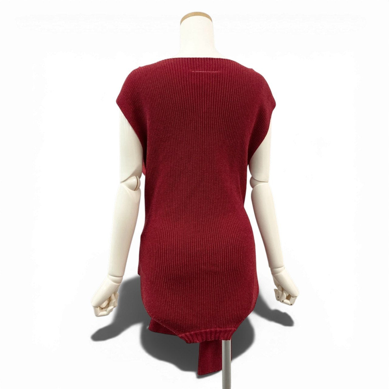 鮮やかなレッド×ホワイトのフラッグチェック柄が印象的なMM6の変形ニットトップスです。柔らかなニット素材で、ドレープ感のある立体的なデザインが特徴的な一着です。首元にはリブ編みのディテールが施され、付属のニットパーツを巻くような独創的な変形デザインがブランドらしいモード感を演出します。デニムやスラックスと合わせるだけで、コーディネートの主役になるアート感のあるスタイルを楽しめます。
