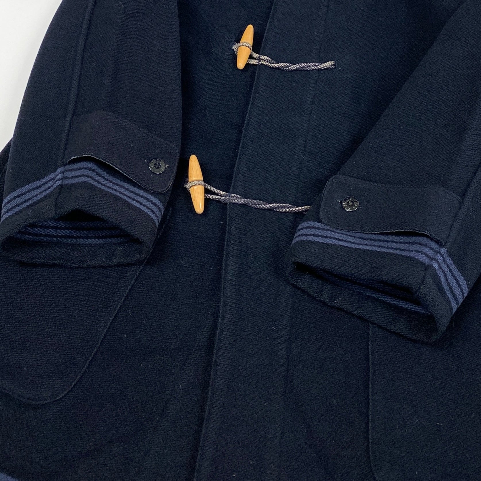 落ち着いたミッドナイトネイビーの無地で、マットなウール系素材感が重厚な印象のダッフルコートです。木製トグルボタンやロープ留め、フード付きデザインに加え、袖のコンパスワッペンがブランドらしいアクセント。身幅に余裕があり、ストリートからカジュアルまで幅広く対応します。真冬のデイリーアウターや長時間の外出、防寒重視のシーンにおすすめの一着です。