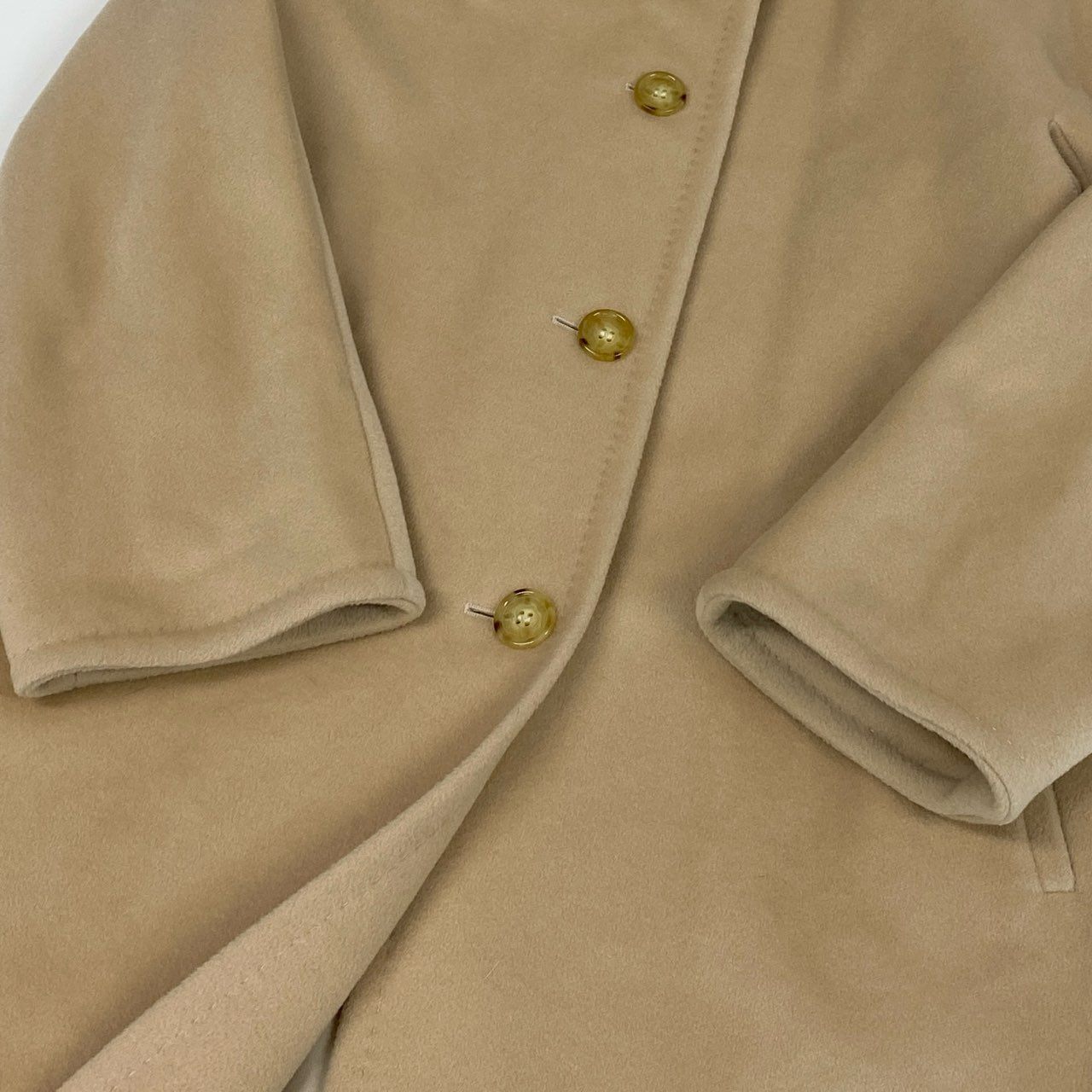 Max Maraの上質さが際立つウールロングコートです。 カラーは上品なベージュで、落ち着きがあり大人の装いに取り入れやすい一着です。 マットで滑らかなウール素材に、シンプルなステンカラーと比翼風のフロントデザインが特徴です。 通勤からきれいめなお出かけまで対応でき、長く愛用できるタイムレスなコートとしておすすめです。