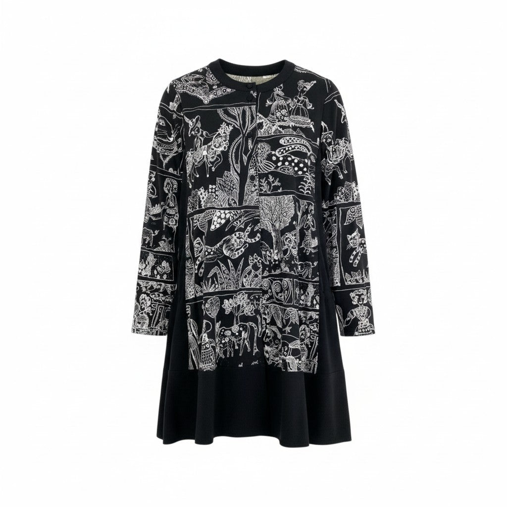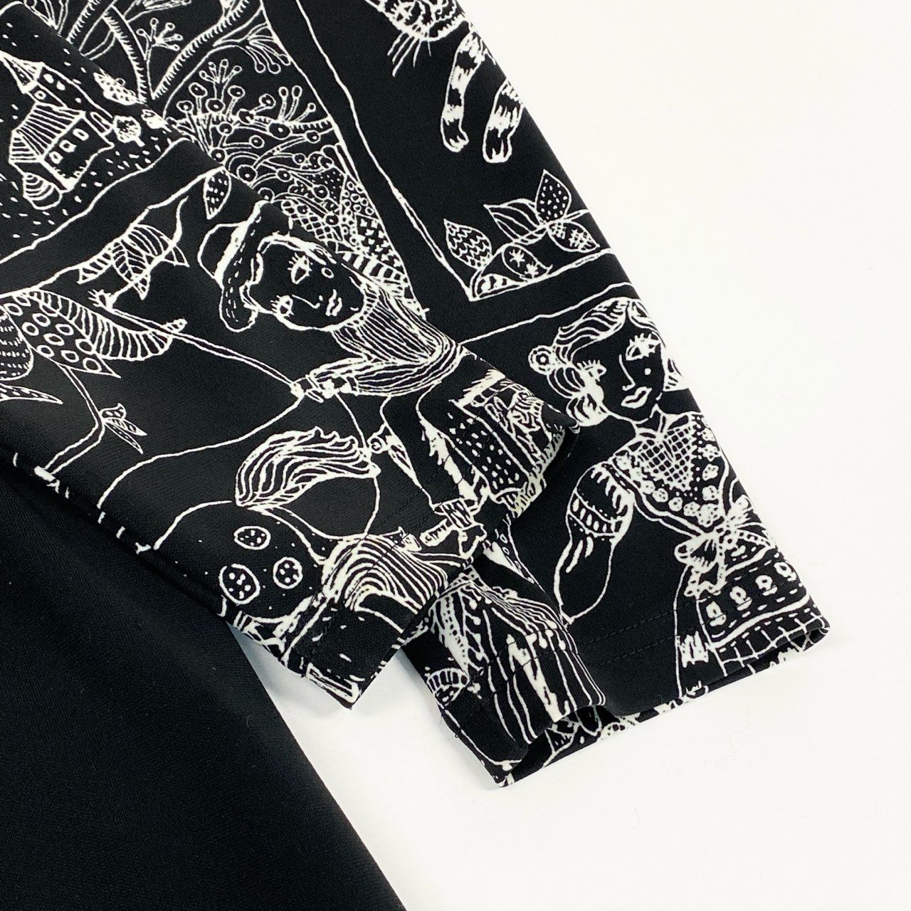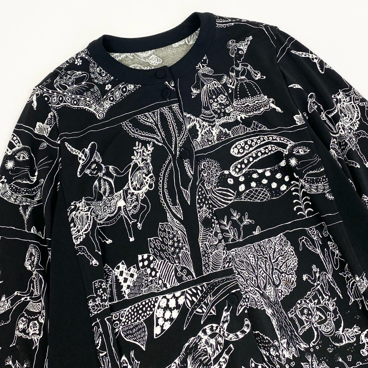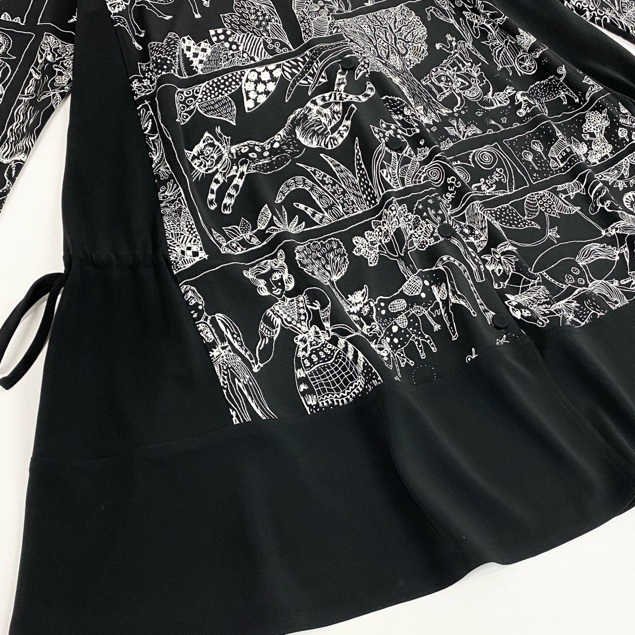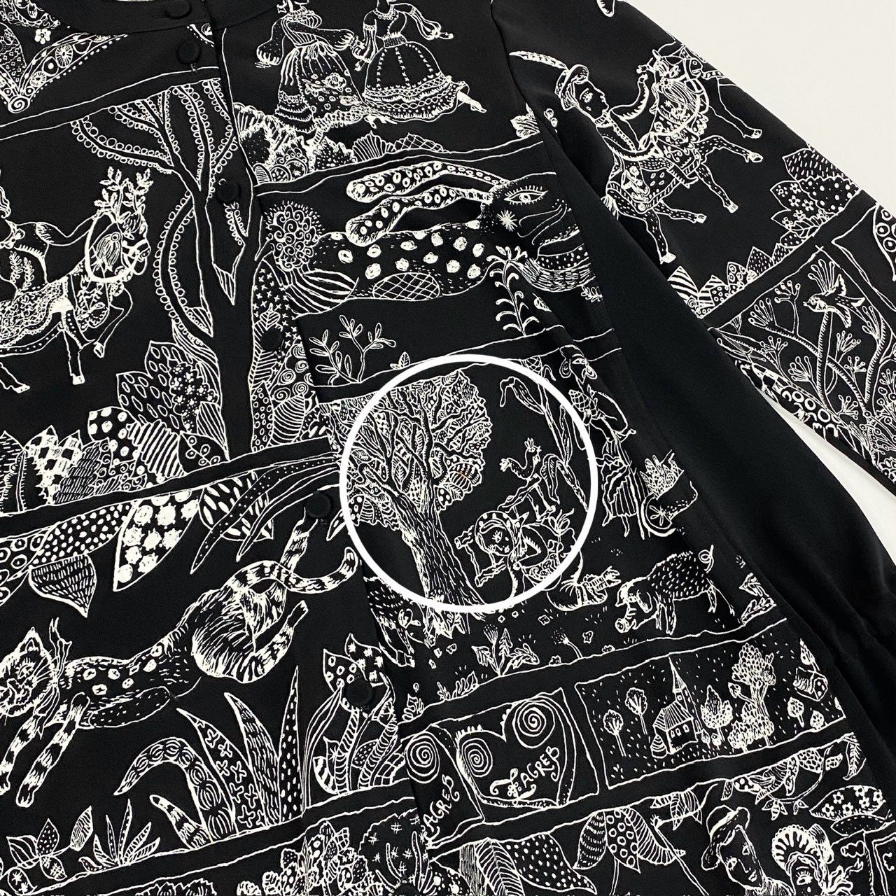 モノトーンのアニマルモチーフ総柄が印象的な、トクコプルミエヴォルの長袖シャツワンピース。ブラック×ホワイトの細やかな線画プリントがアートのように配置され、1枚で存在感のあるデザインです。ウエストにはサイドリボンがあり、シルエット調整が可能。柔らかく落ち感のある素材で、動くたびにふんわり広がるフェミニンさが魅力。お出かけ・旅行・デイリーコーデまで幅広く活躍する一着です。