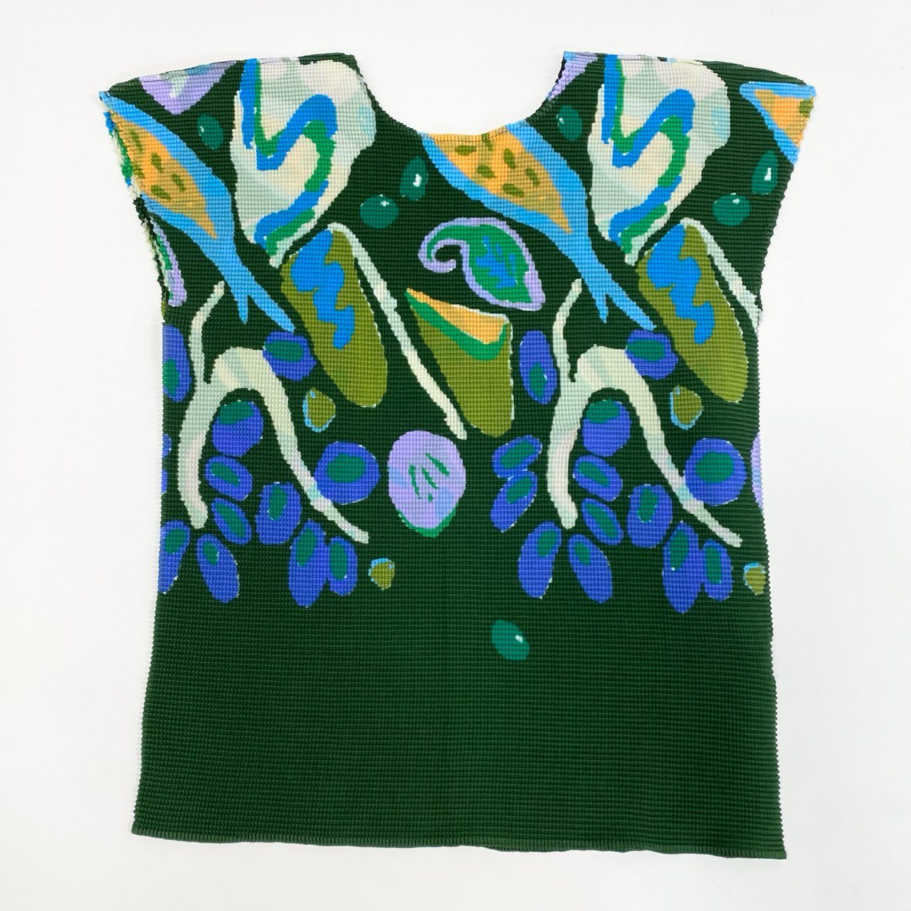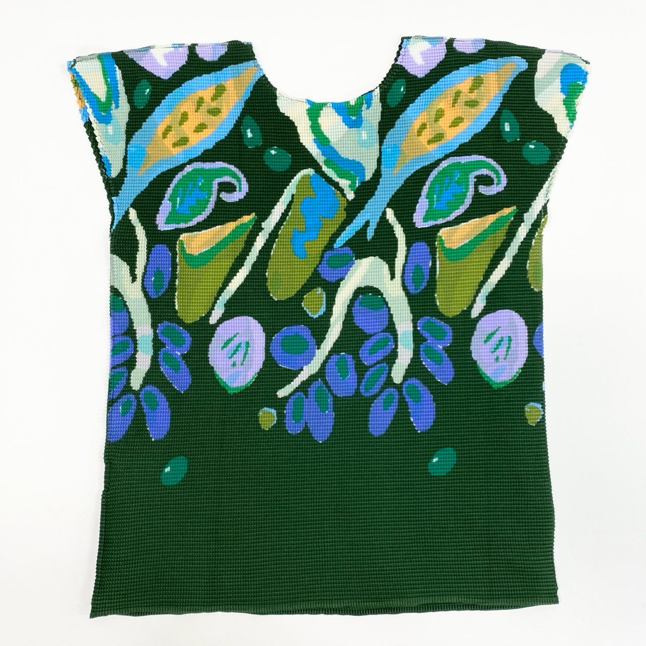me ISSEY MIYAKEの「Berries Micropleat Top」。深いフォレストグリーンをベースに、ブルーやパープル、オリーブを散りばめたベリー柄のアートプリントが印象的です。ブランドならではのマイクロプリーツ素材は、マットな質感ながらも立体的な陰影を生み出し、身体にしなやかにフィット。ノースリーブ感覚のフレンチスリーブで、1枚でもインナーとしても活躍。アートピースのような存在感を放つ一着です。