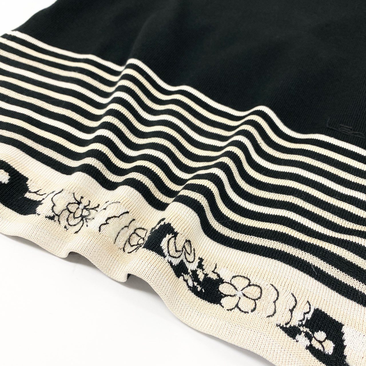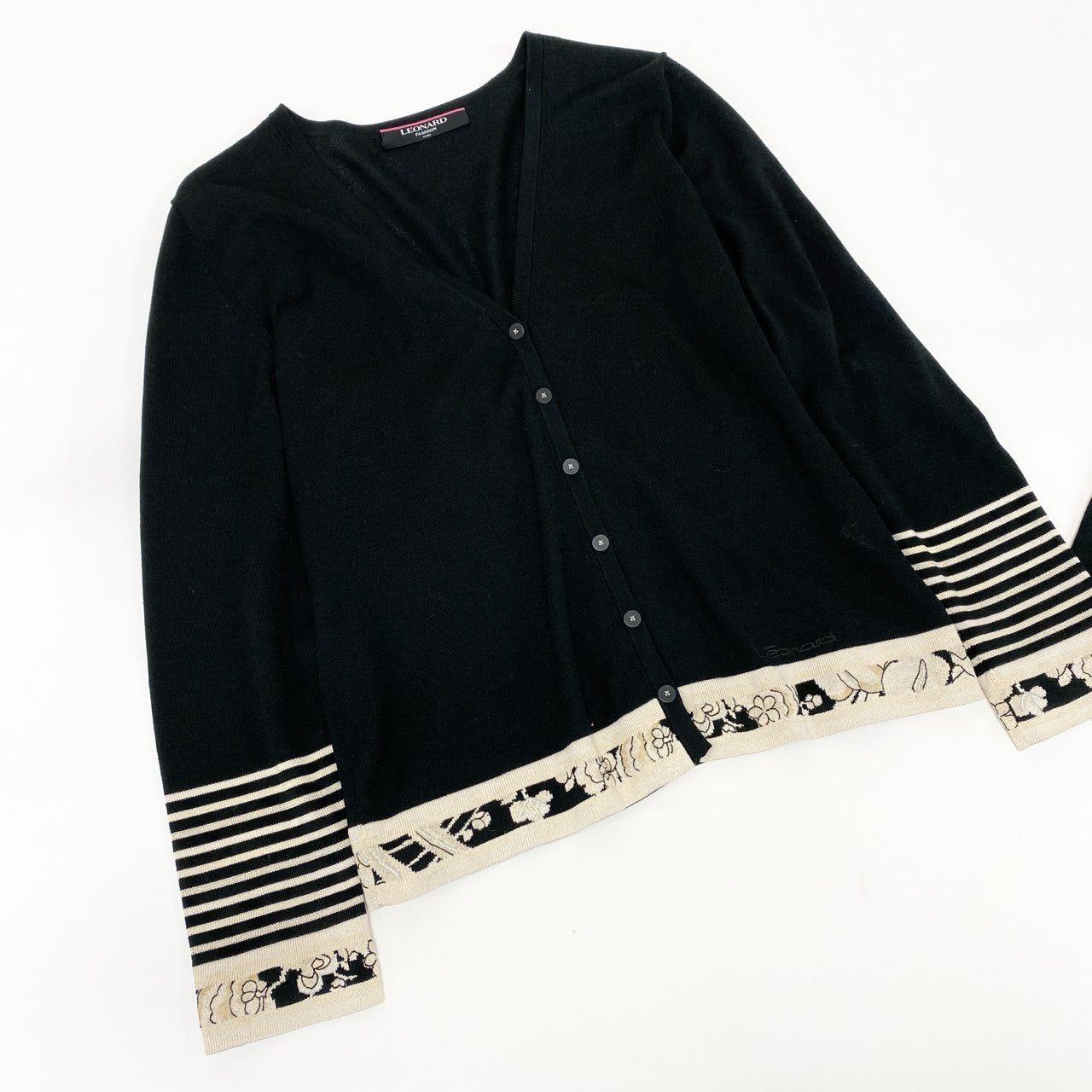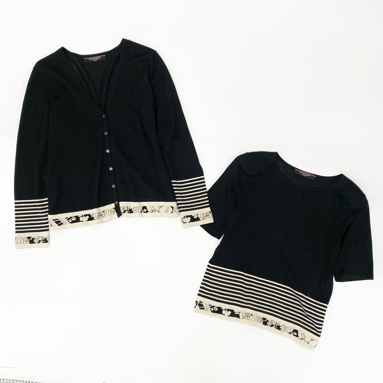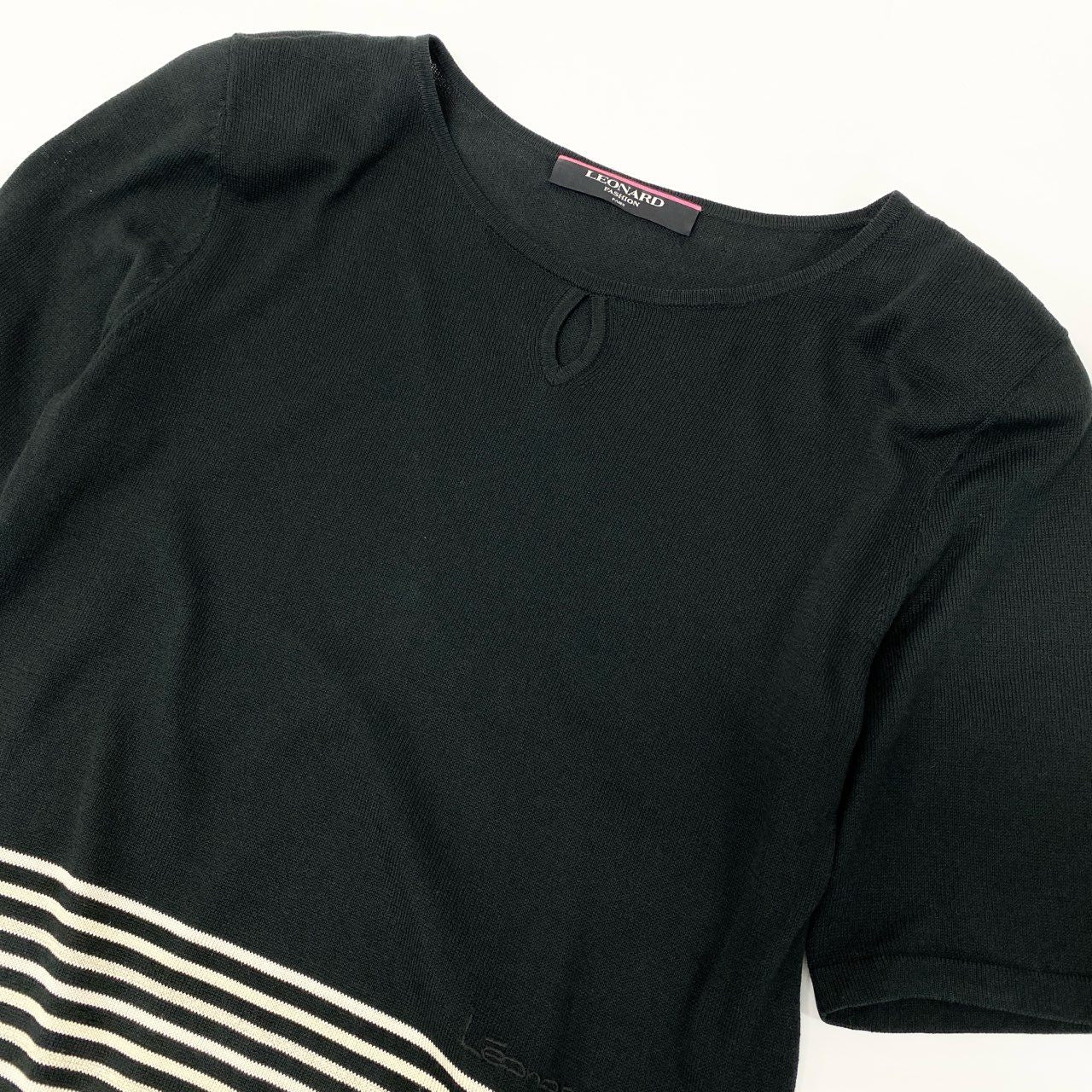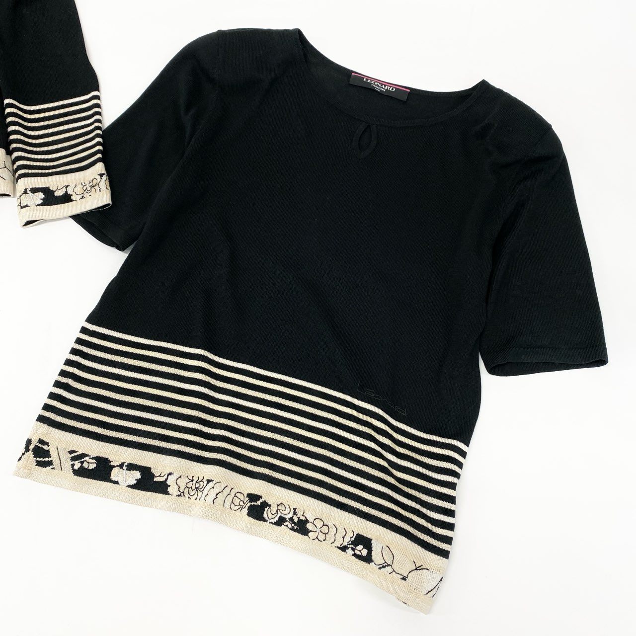 4k23《美品》 LEONARD FASHION レオナール アンサンブルニット ツインニット 半袖トップス カーディガン ボーダー柄 花柄刺繍 シルク混 L ブラック ホワイト系u02t