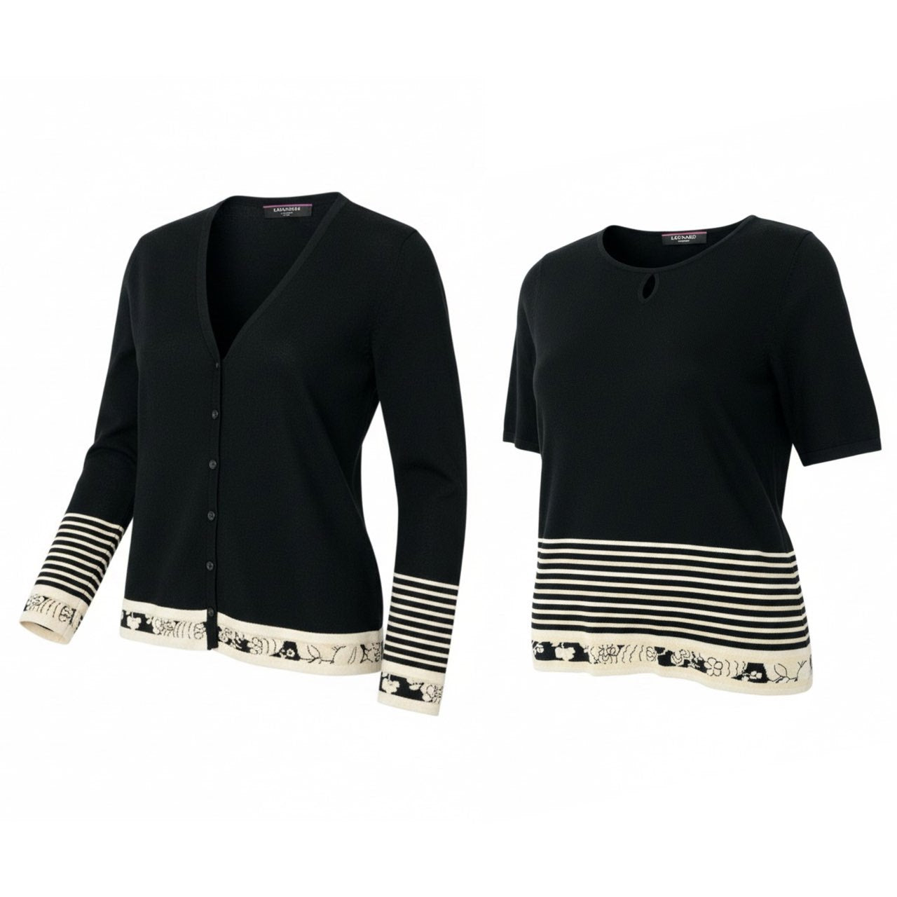 カラーは上品なブラック × アイボリーで、裾と袖口に施されたストライプ柄とLEONARDらしいボタニカル風モチーフがアクセントになったニットアンサンブルです。素材は滑らかで上質感のあるニット生地(ハイゲージ・中厚手)で、季節を問わず長く着用できる使い勝手の良い質感です。半袖ニットはさりげない涙開きのキーネックデザインが女性らしさを演出し、単品使いでもコーディネートを上品にまとめてくれます。カーディガンは軽い羽織りとして、きれいめスタイルや食事会、通勤にも活躍する万能なデザインです。セットでも単品でも使えてコーデの幅を広げる一着です。
