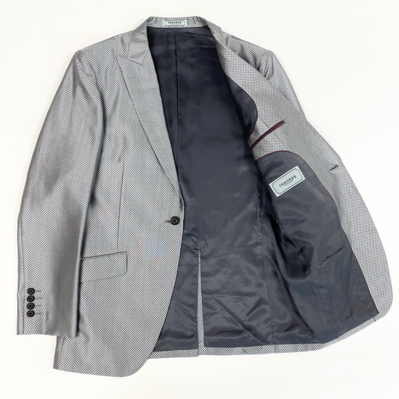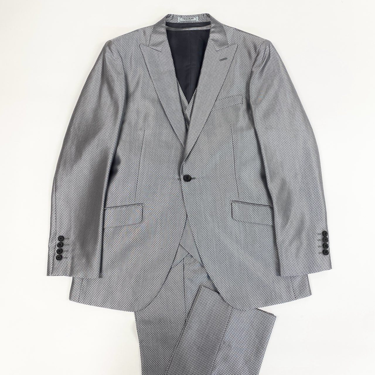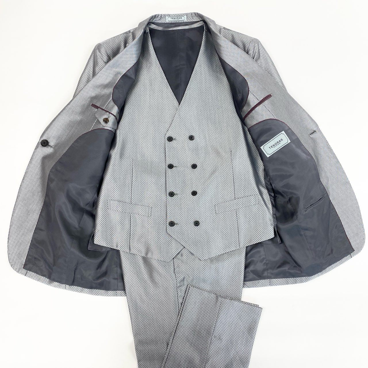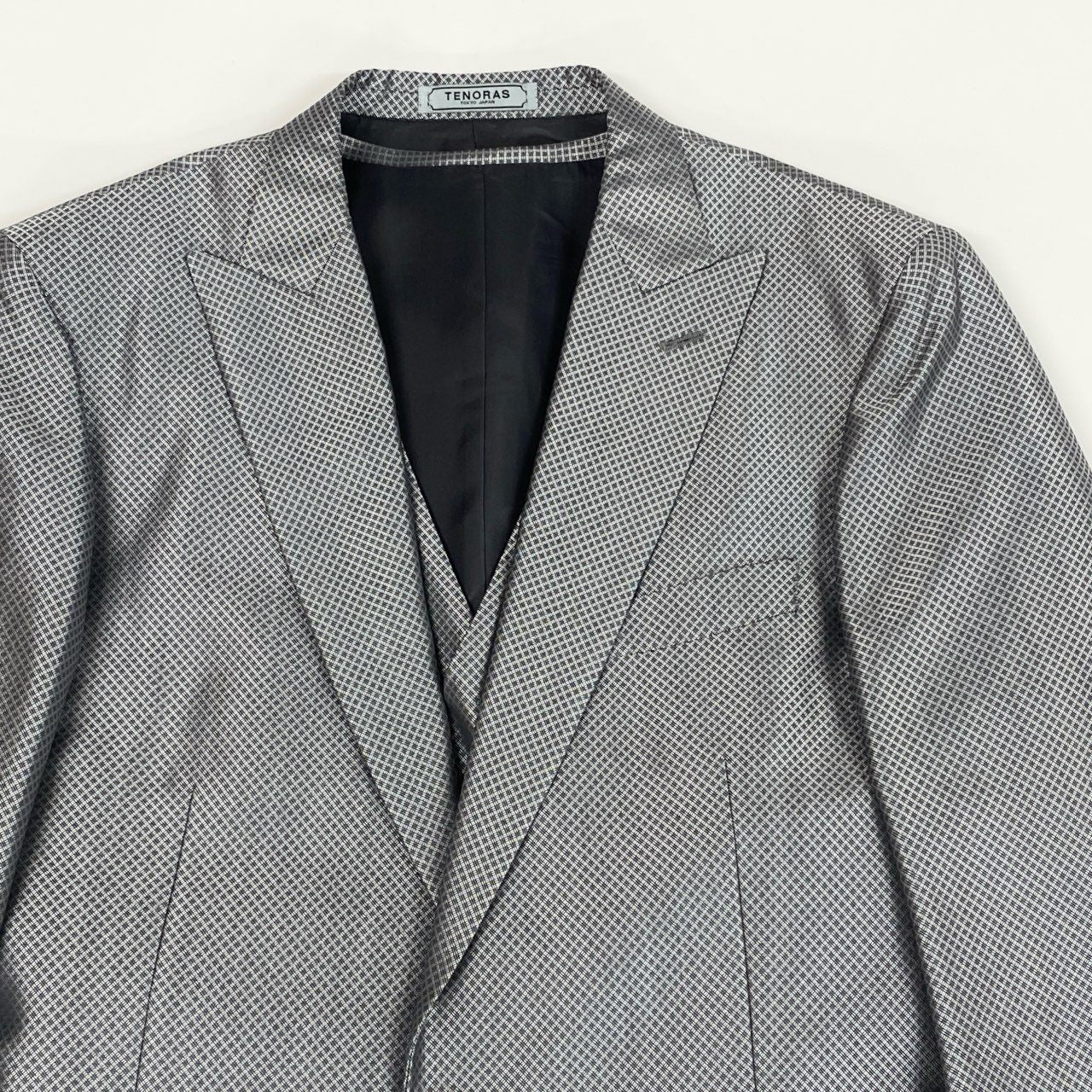 59j6 TENORAS ティノラス 大きいサイズ 3ピース スリーピース セットアップスーツ シングルスーツ 1釦 総柄 パーティー フォーマル LL 光沢グレー シルバーu02t