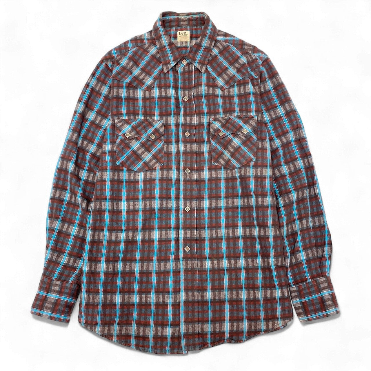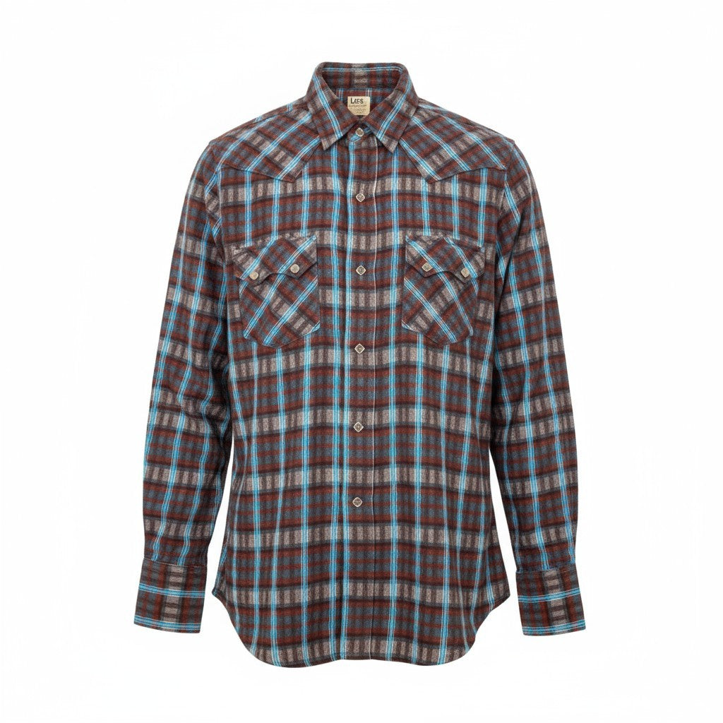 Lee「WESTERNER」シリーズのウエスタンシャツ。ブラウン×レッド×ターコイズブルーのチェック柄が印象的で、カジュアルながらも存在感のある1着です。胸元のフラップポケットやヨーク切替など、ウエスタンシャツらしいクラシックなディテールがポイント。コットン100%の柔らかな生地感で、季節を問わず着回しやすい仕上がりです。デニムやワークパンツはもちろん、スラックスに合わせて外した大人カジュアルにもおすすめです。