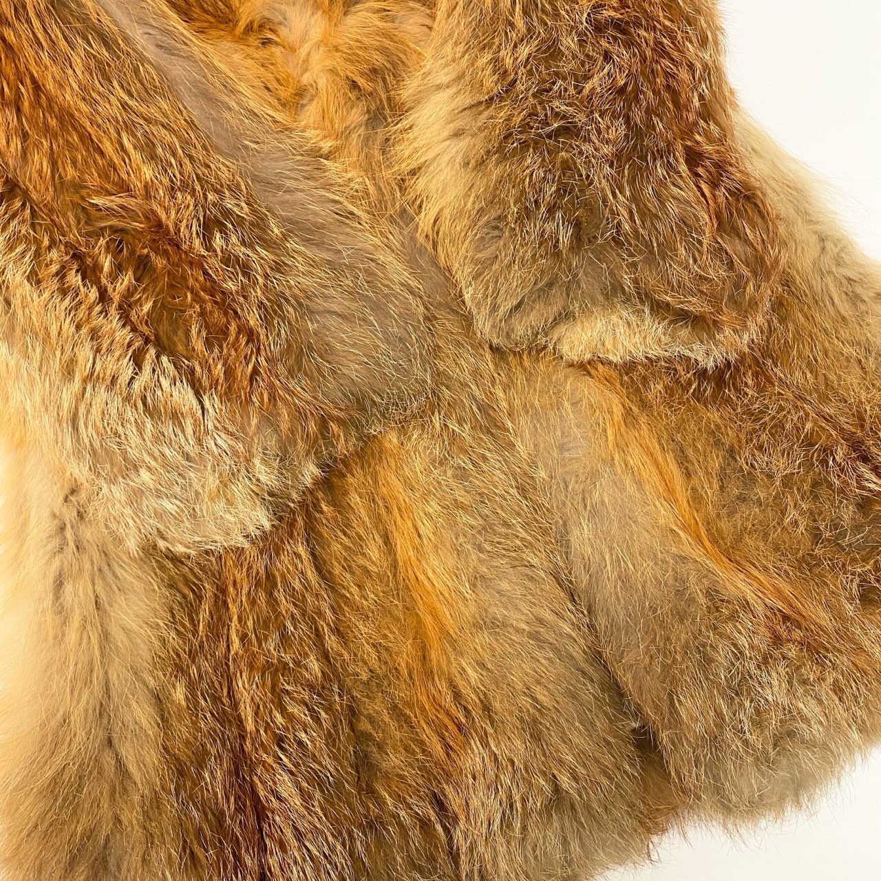 艶のあるゴールドブラウン〜ライトブラウン系のグラデーションが美しい、レッドフォックス素材の毛皮コートです。全面に毛足の長い天然ファーを使用しており、非常にボリューム感と高級感があります。縦の切り替えによるストライプ状のパターンが、シルエットをすっきりと見せてくれるデザインです。存在感がありながらも落ち着いた色味で、デニムからドレススタイルまで幅広く合わせられます。冬のお出かけやフォーマルシーン、特別な日のアウターとしてもおすすめの一着です。