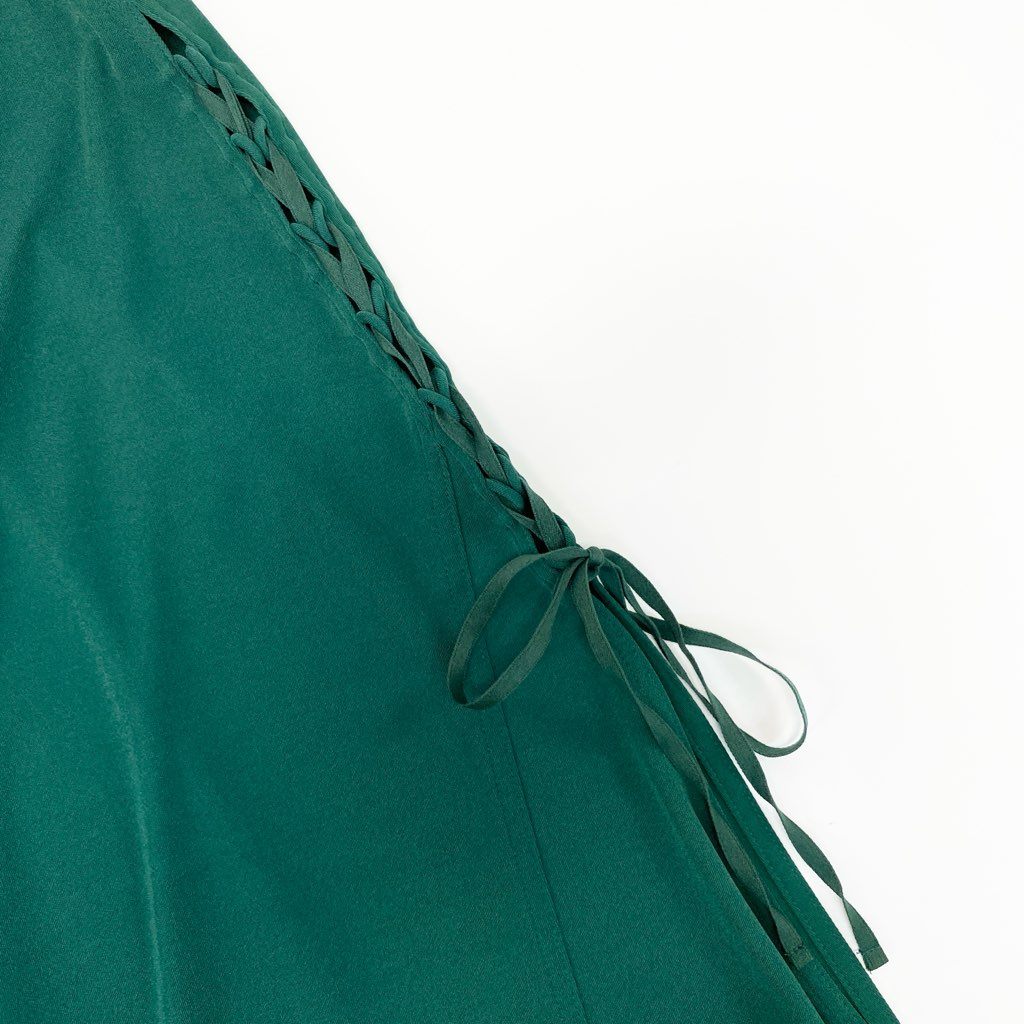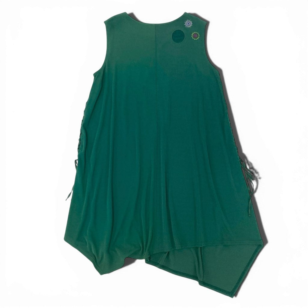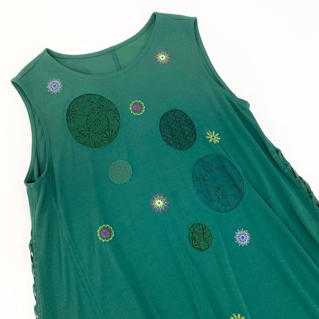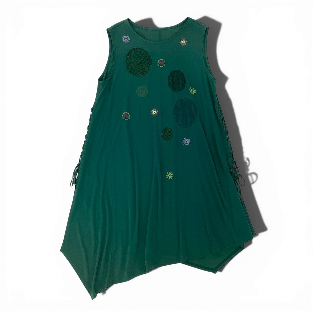 深みのあるグリーンをベースに、円形の花柄モチーフをあしらった印象的なノースリーブワンピースです。裾に向かって揺れ感の出るシルエットと、サイドのレースアップディテールがデザイン性を高めています。軽やかで落ち感のある素材感が、動くたびに美しいドレープを演出。1枚で主役になるのはもちろん、パンツとのレイヤードスタイルにも映えるトクコプルミエヴォルらしい一着です。