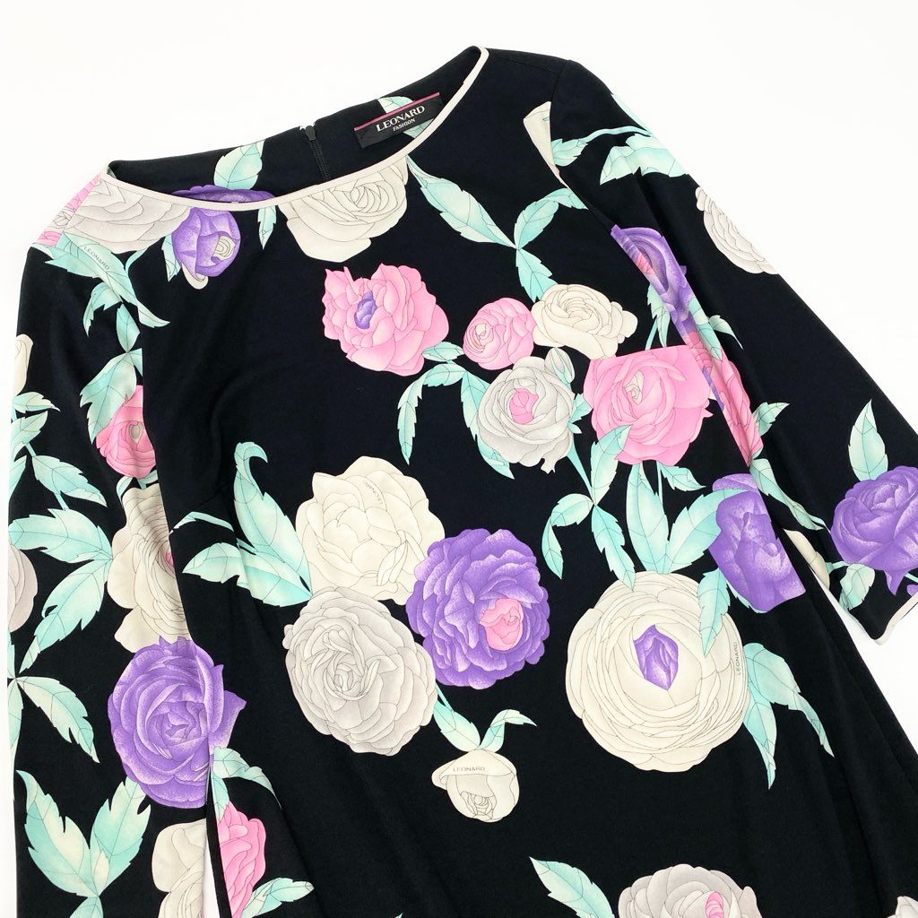 深みのあるブラックベースに、ローズモチーフのフラワープリントが映えるLEONARDのワンピースです。ピンク・パープル・アイボリーの配色が華やかで、上品な存在感を演出します。なめらかで落ち感のある素材感に、袖口と裾のパイピングがさりげないアクセント。1枚でコーディネートが完成し、食事会やお出かけ、きれいめなシーンにおすすめの一着です。