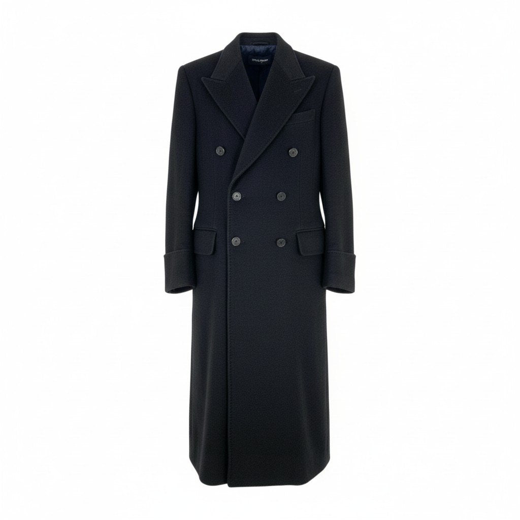 深みのある ブラックカラー と、なめらかな風合いの 高級カシミヤ素材 が上質さを引き立てるロングコートです。構築的なピークドラペルと ダブルブレストのメタル調ボタン がクラシックな存在感を演出し、ドレッシーなスタイルに相性抜群。ダブルフェイス仕立てのため、生地に程よい厚みがありながらも上品な落ち感があります。フォーマルなシーンはもちろん、ジャケットの上にも羽織れるシルエットで冬のメインコートとして活躍します。ドルチェ&ガッバーナらしいエレガントな雰囲気を求める方におすすめの一着です。