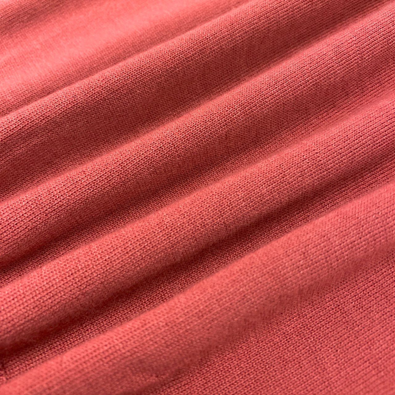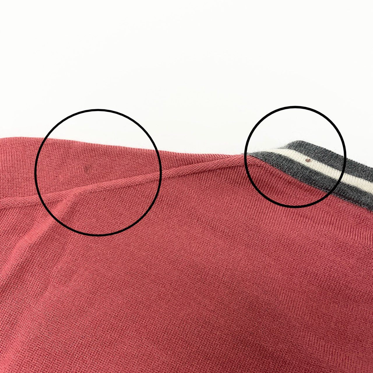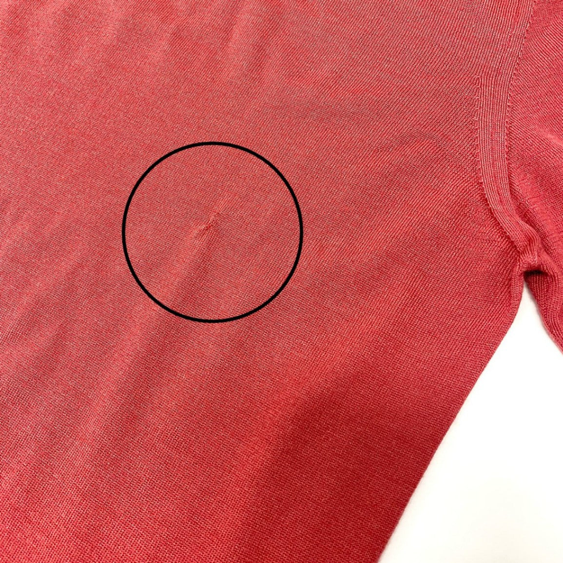 エルメスのクルーネックニットで、落ち着いたテラコッタレッドに、襟元・袖口・裾へ配されたカーキグリーン×ライトグレーのラインが控えめなアクセントになった一着です。素材はカシミヤシルクで、しっとりとした滑らかさと軽い着心地が特徴。薄手ながら保温性があり、ジャケットやアウターのインナーにも使いやすい万能ニットです。上質素材ならではの上品な光沢感があり、大人のカジュアルスタイルに品を添えてくれます。