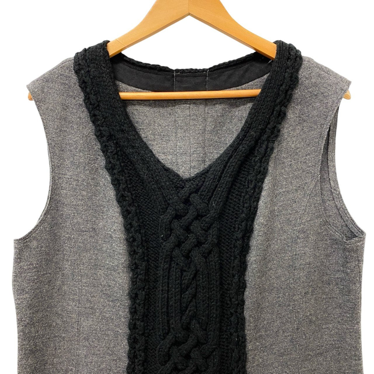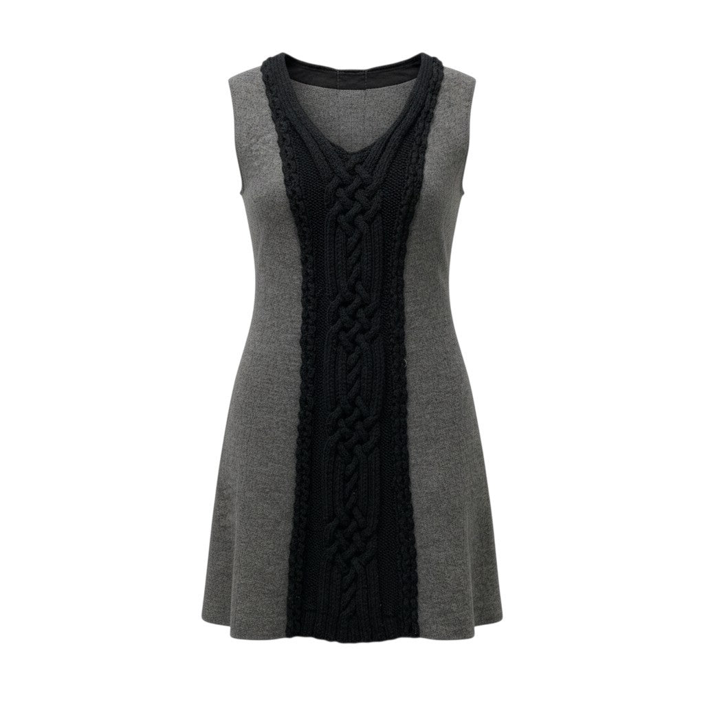 落ち着いたミディアムグレーをベースに、フロントへブラックのアラン編み(ケーブル編み)切替を施した上品なノースリーブワンピースです。毛足の短いマットなウール100%素材で、あたたかみのある質感が魅力。無地×立体編みのコントラストが縦ラインを強調し、すっきりとした印象を演出します。シャツやタートルネックとのレイヤードスタイルで、秋冬のお出かけや通勤コーデにも活躍する一着です。