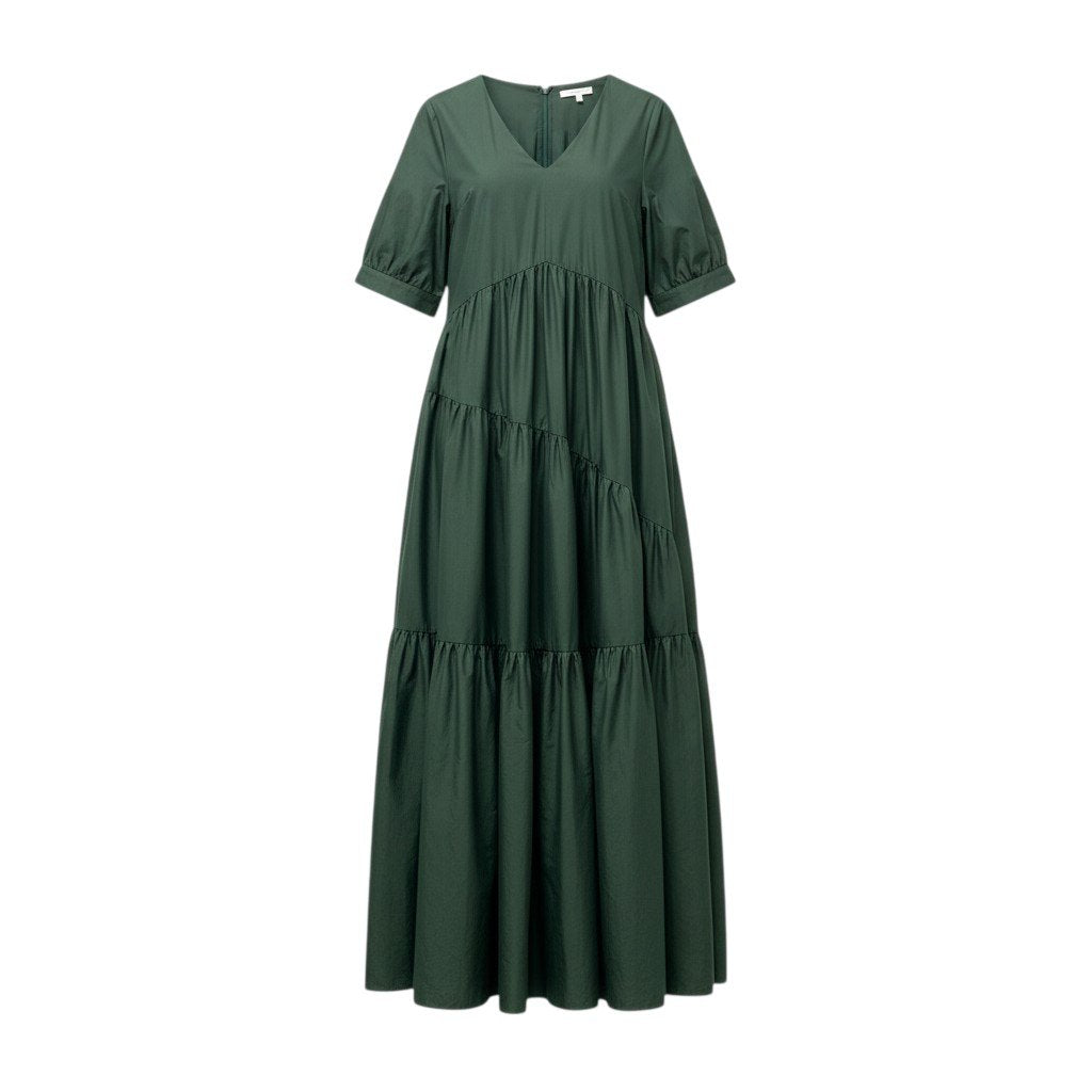 深みのあるカーキグリーン系カラーが落ち着いた印象のロングワンピースです。マットなコットン系のようなナチュラルな素材感に、段切替のティアードデザインが女性らしい立体的なシルエットを演出します。Vネックと半袖デザインで首元がすっきり見え、春夏シーズンに軽やかに着用可能。1枚で主役になるデザインで、デイリーからリゾートスタイルまで幅広く活躍するアイテムです。