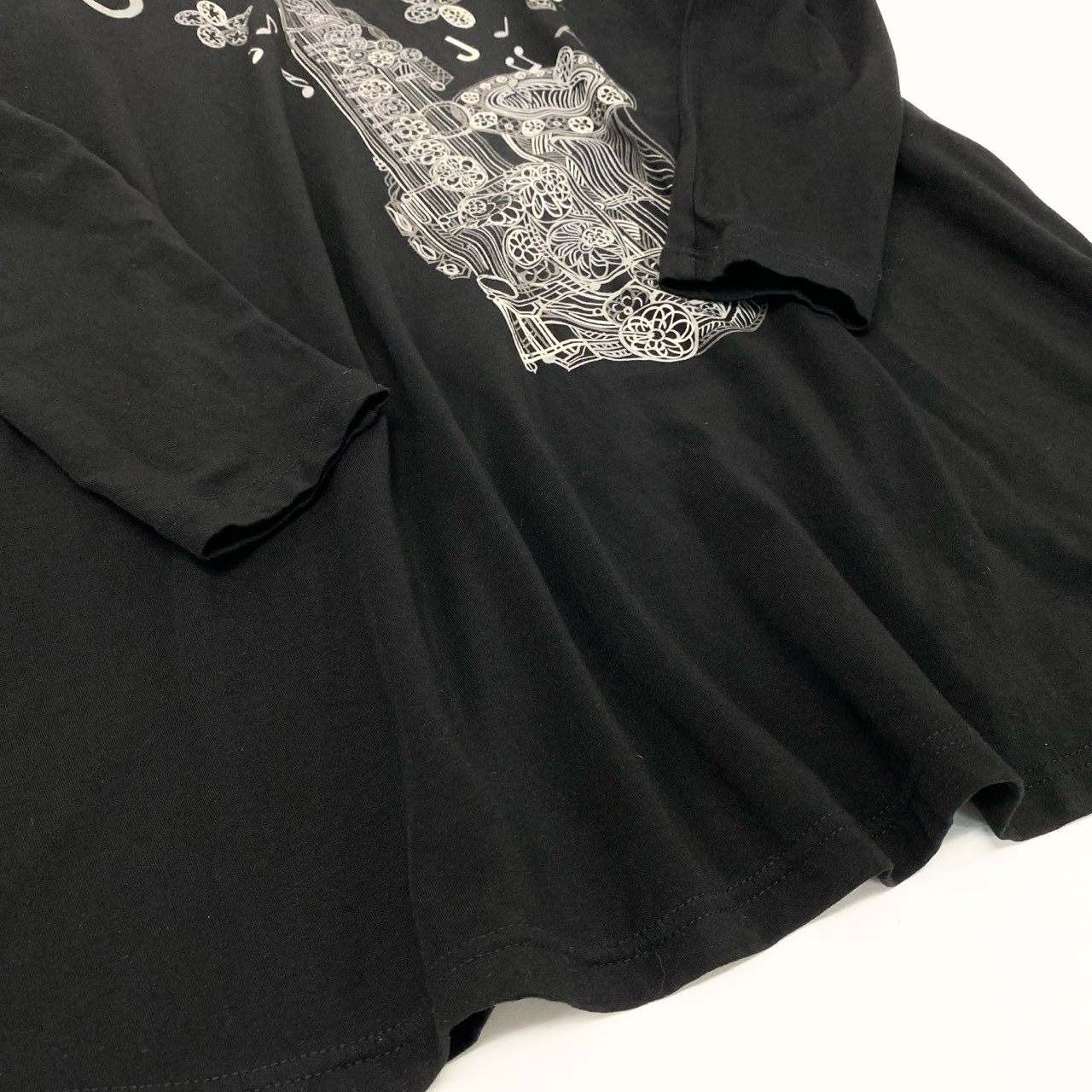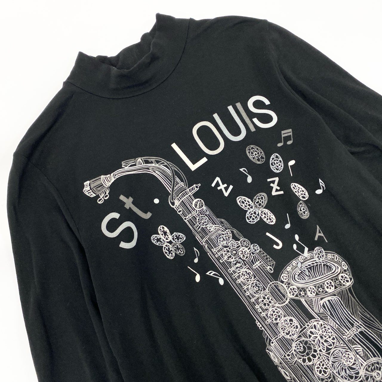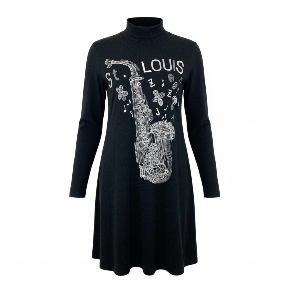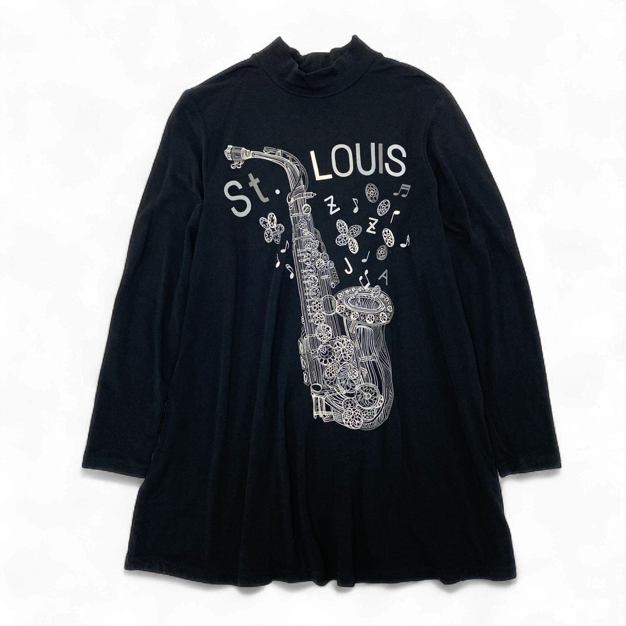 トクコプルミエヴォルらしい存在感あるサックス(楽器)プリントが印象的な長袖チュニックワンピースです。カラーは深みのあるブラックで、白の線画プリントが映えるモードな雰囲気。モックネック×Aラインの上品なシルエットに、ストレッチの効いたジャージー素材を使用し、着心地も快適です。1枚でワンピース風にも、細身パンツと合わせてチュニックスタイルにもできる万能デザイン。お出かけやデイリー、ステージ衣装風の着こなしにも相性抜群のアイテムです。