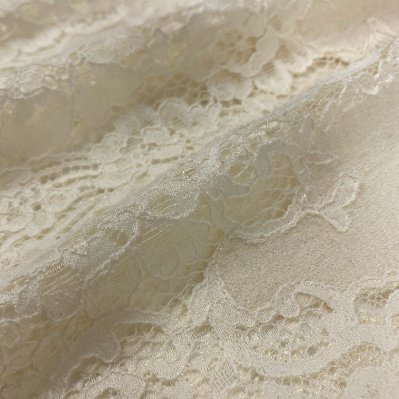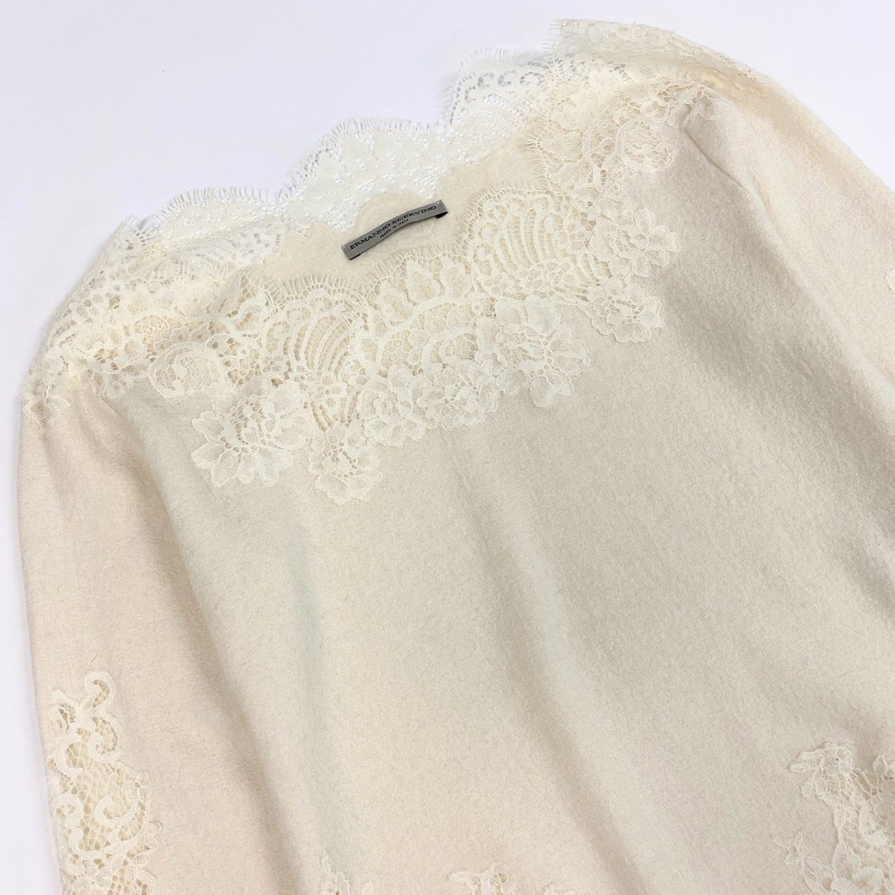 エルマンノシェルヴィーノのアイボリーカラーニットセーター。上質なカシミヤ混ウール素材に、繊細なレース装飾をあしらった華やかなデザインが特徴です。ネックラインから裾、袖口にかけて施されたスカラップレースが、フェミニンでエレガントな雰囲気を演出。柔らかな肌触りと軽い着心地で、フォーマルな場からお出かけシーンまで幅広く活躍する一着です。