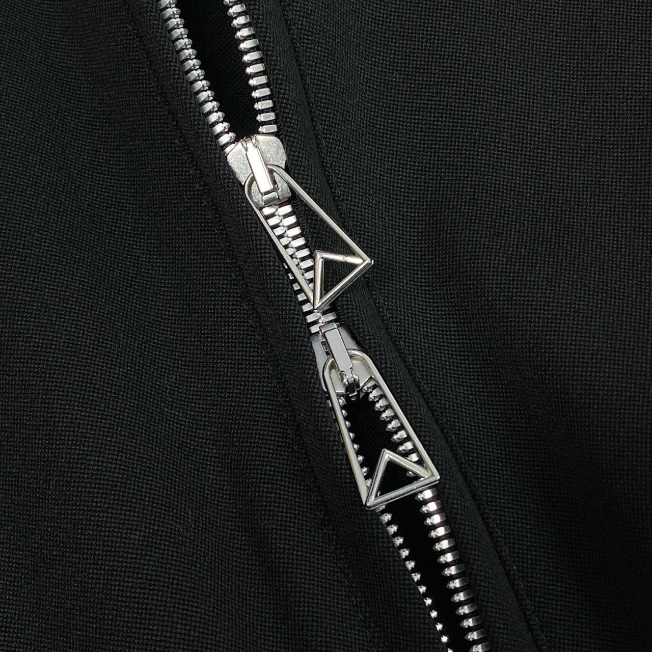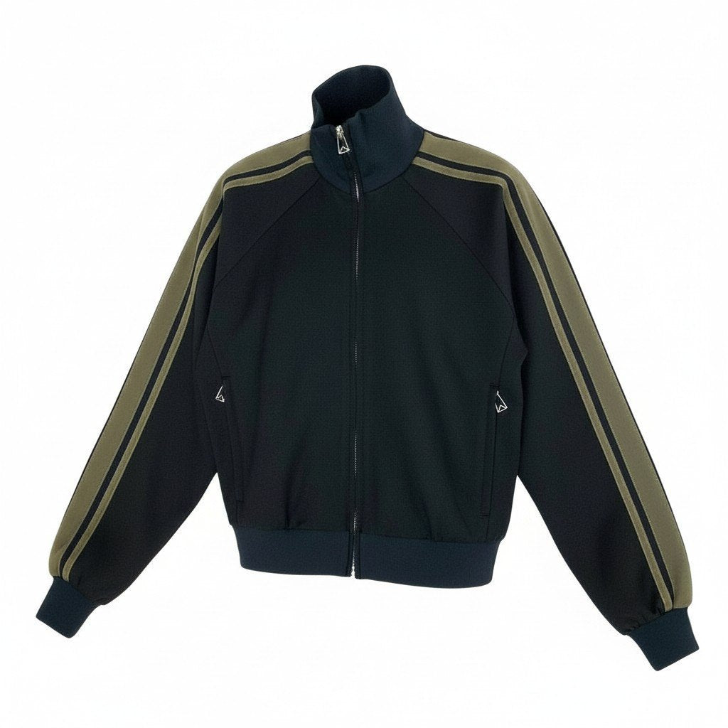 Bottega Venetaらしいミニマルかつ上質なジャージブルゾンです。カラーはブラックを基調に、アームラインへ配されたオリーブカーキのラインが映えるスポーティーな配色。マットでしっかりしたジャージ素材に、ハイネック仕様とメタルジップが洗練された印象を加えます。カジュアルなデニム合わせはもちろん、スラックスと合わせたモード寄りのスタイリングにも相性の良い一着です。