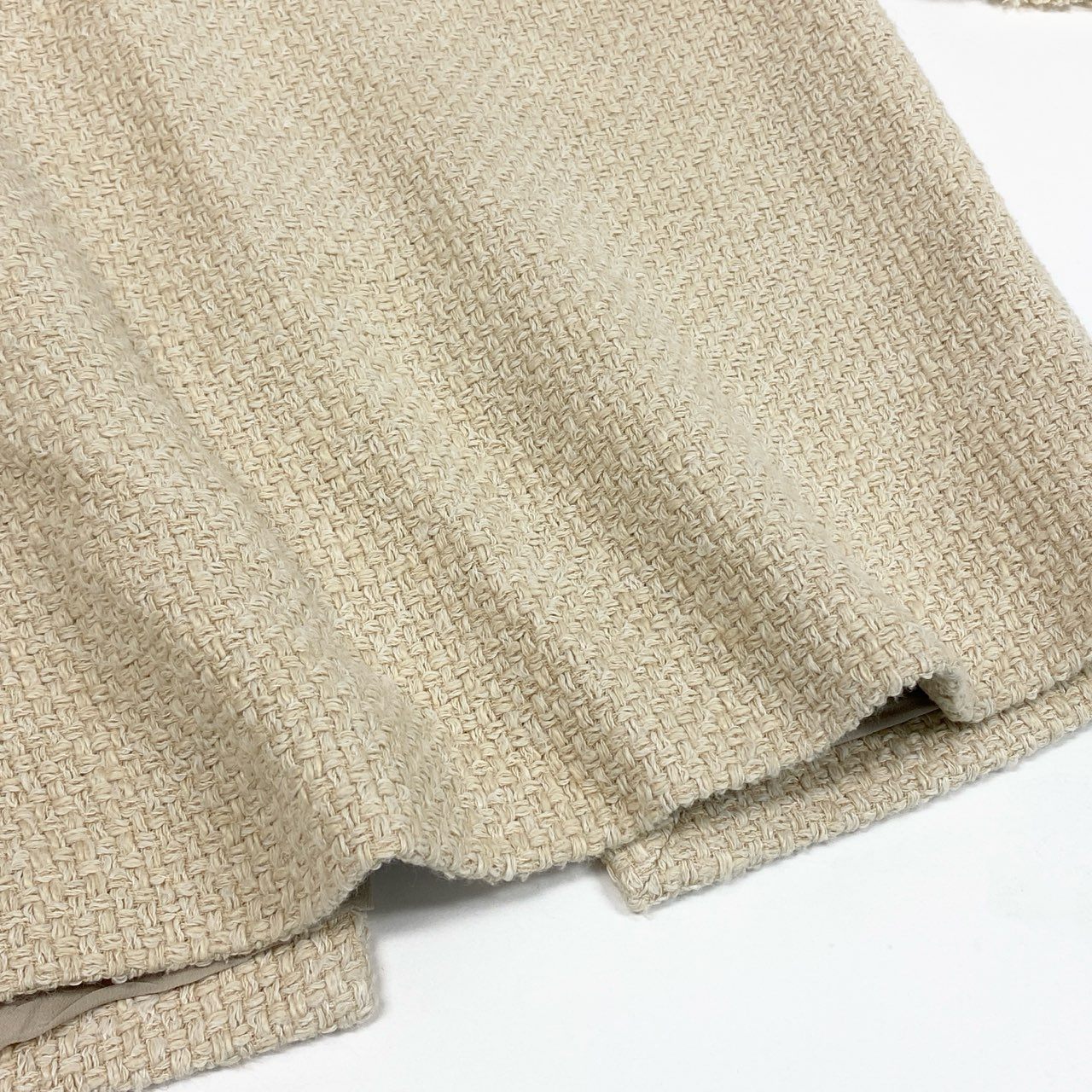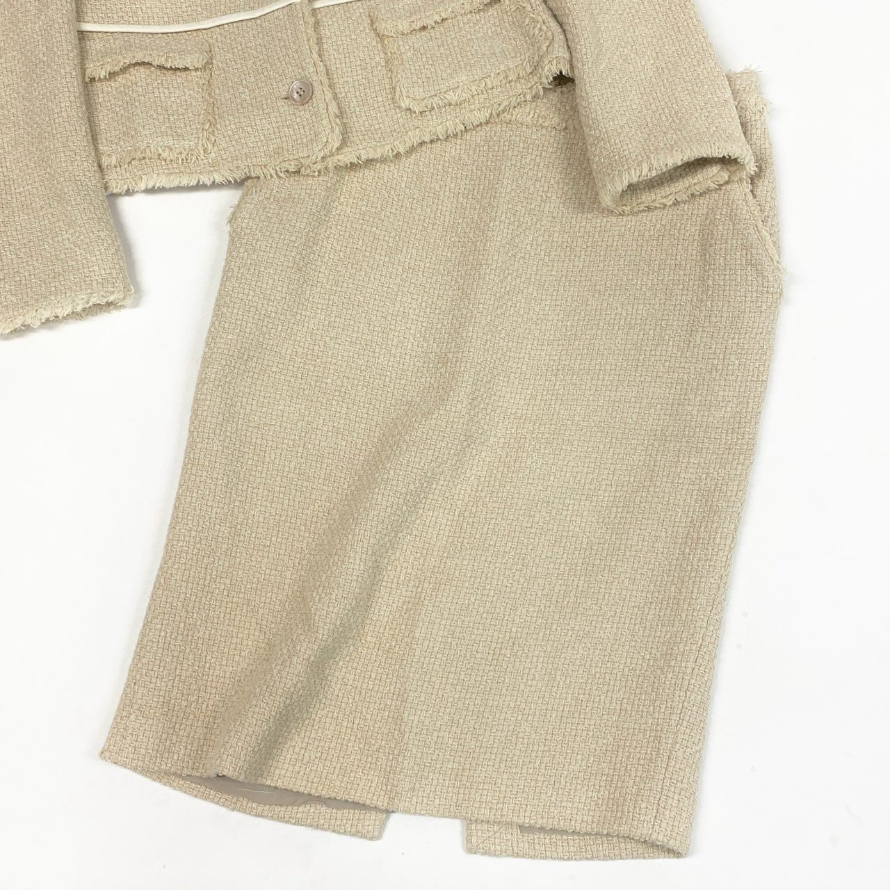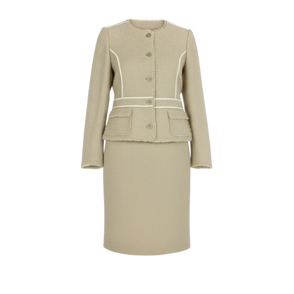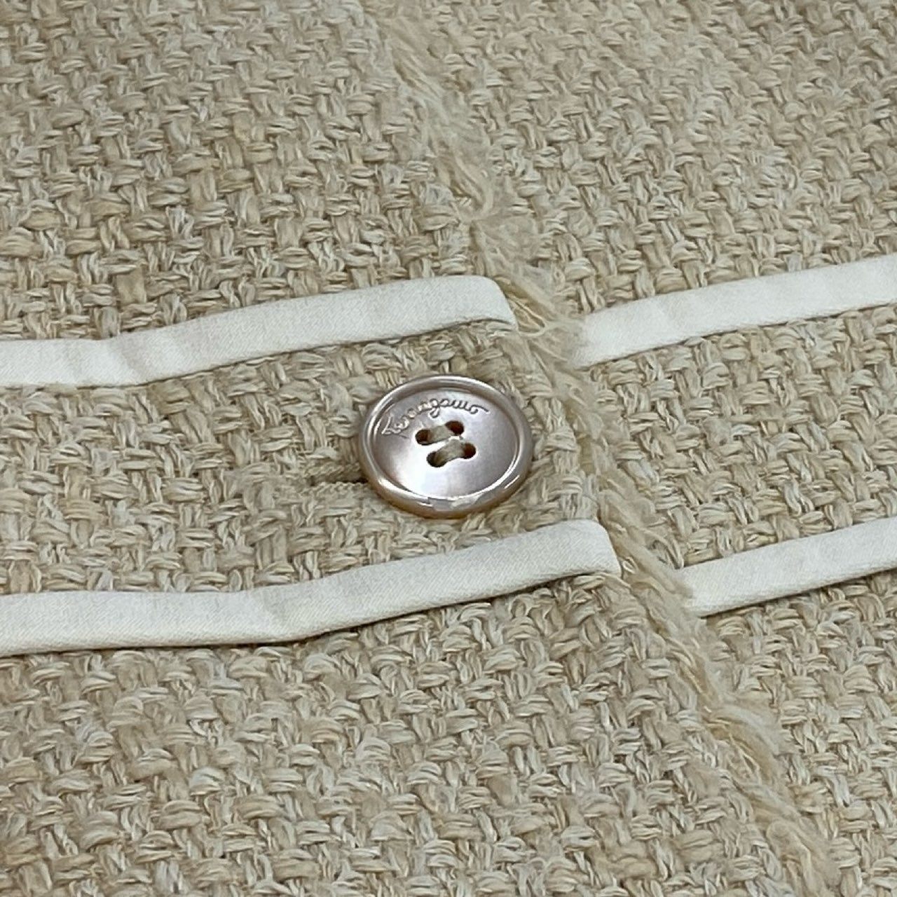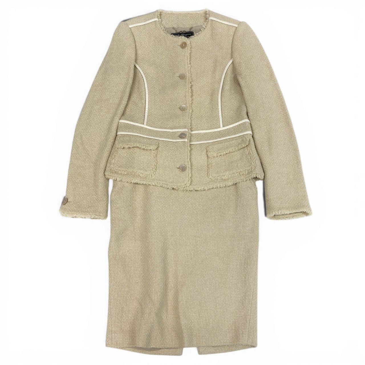サルヴァトーレフェラガモのツイード素材スカートセットアップです。上品なライトベージュカラーに、立体感のあるツイード生地がクラシックでエレガントな印象を演出します。ホワイトのパイピングデザインとフリンジディテールがアクセントになり、洗練されたフェミニンスタイルを引き立てます。ジャケットとスカートのセットアップでフォーマルシーンやセレモニー、ビジネスシーンにも活躍する上品な一着です。