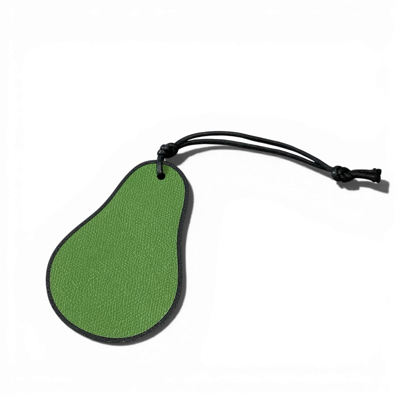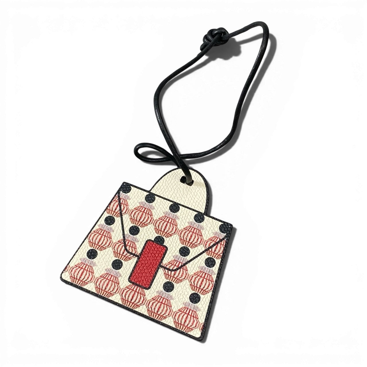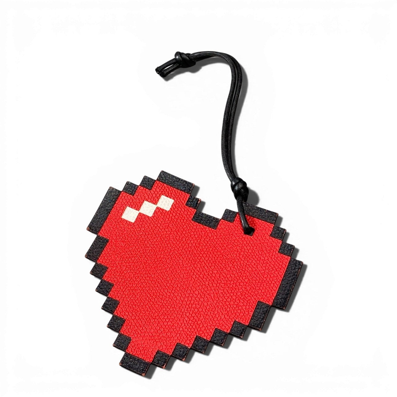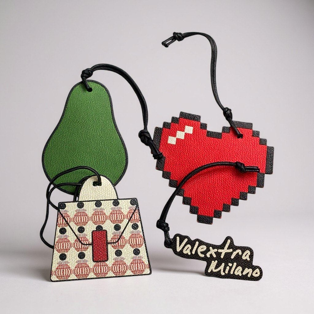アップルグリーン、レッド、アイボリーを基調に、ハート(ピクセル調)やミニバッグモチーフを組み合わせた遊び心のあるチャームです。シボ感のあるマットレザーに、ブラックの縁取りとコードが全体を引き締めます。手書き風のロゴプレートがアクセントになり、バッグに付けるだけで表情が変わります。**Valextra**らしい上質素材とミニマル×ポップなデザインで、ギフトにもおすすめです。