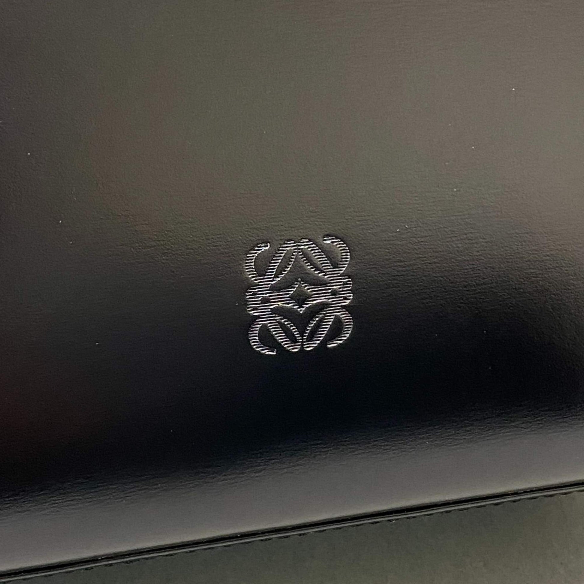 ロエベのヴィンテージラインより、艶のあるブラックレザーを使用した上品なハンドバッグです。フロントにさりげなく施されたアナグラムロゴが洗練されたアクセント。 丸みのあるハンドルとミニマルなボックスシルエットがクラシックで、ドレススタイルからきれいめカジュアルまで幅広くマッチします。 小ぶりながら必要な小物がしっかり入り、特別なシーンやお出かけ用にもおすすめの一品です。