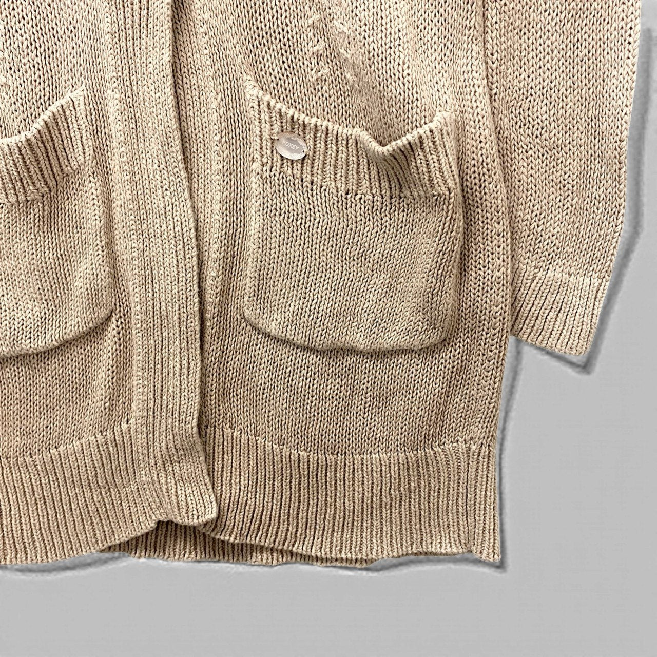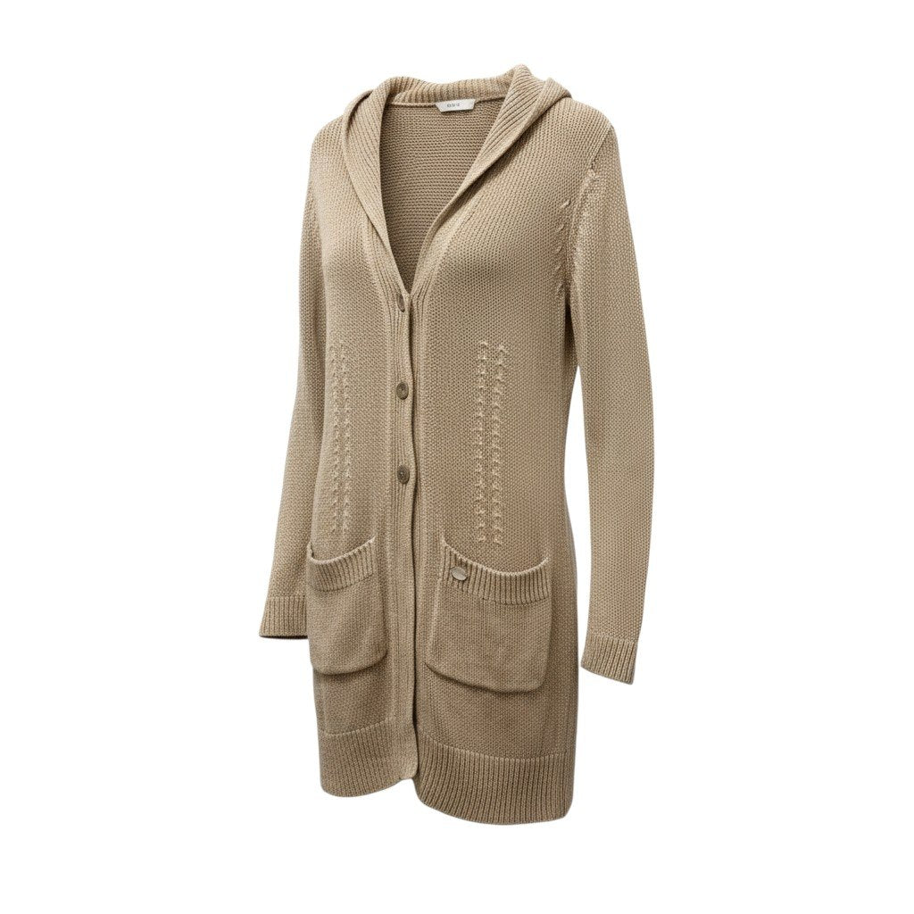 やわらかなベージュ(サンドベージュ系)のローゲージニットロングカーディガンです。 ざっくりとした編み地のマットなニット素材で、温かみのあるナチュラルな風合いが魅力です。 フードデザインとフロントボタン、立体的な大きめポケットがカジュアルなアクセントに。 ワンピースや細身パンツと合わせた大人のリラックススタイルにおすすめの一着です。