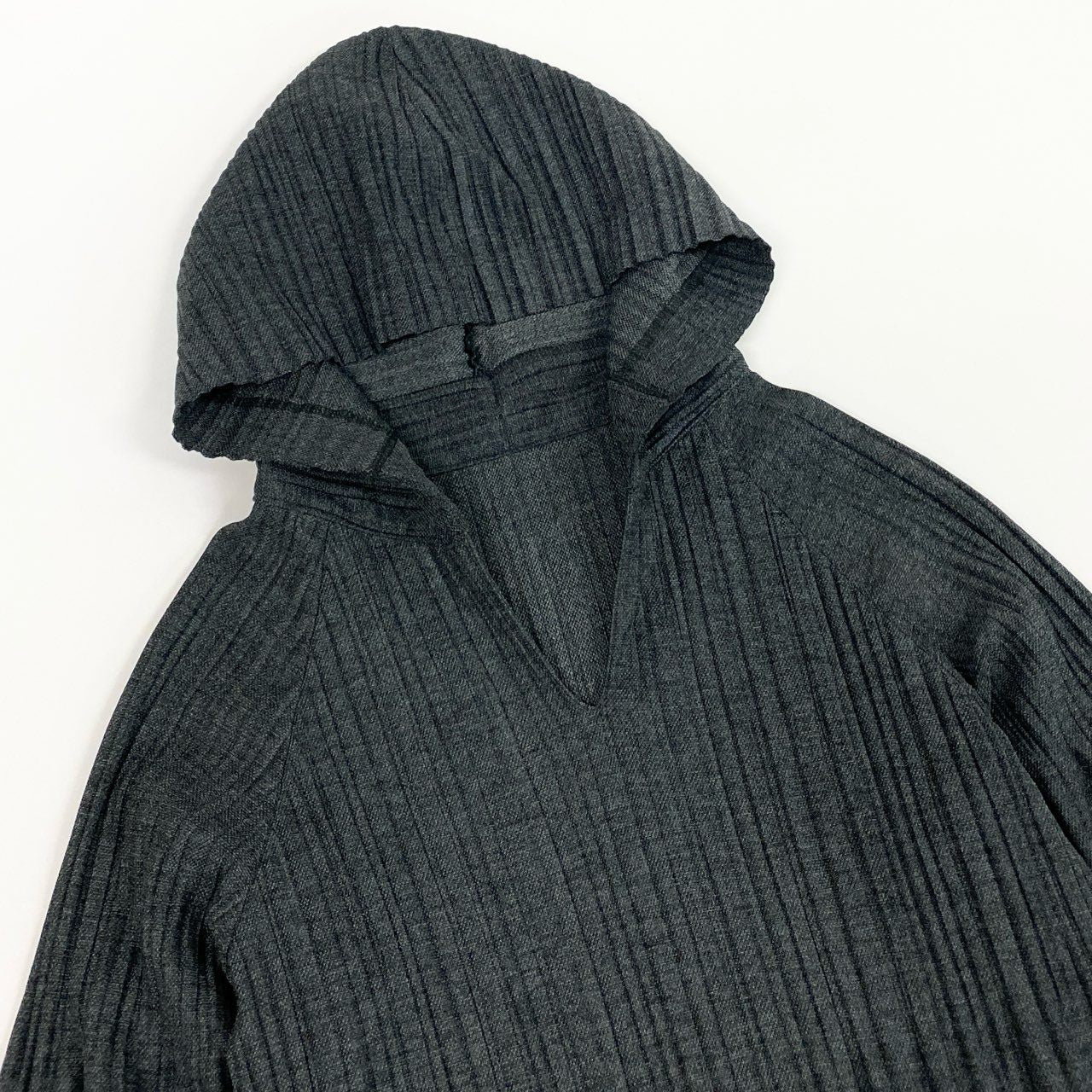 プリーツプリーズらしい機能美が際立つ、フーディー仕様のロングプルオーバーです。 縦リブプリーツが身体のラインを自然に整え、ラフになりすぎない印象。 落ち着いたチャコールグレーで合わせやすく、デイリーからワンマイルウェアまで活躍します。 ポリエステル100%素材で軽量かつ扱いやすく、レギンスや細身パンツとの相性も良い一着です。