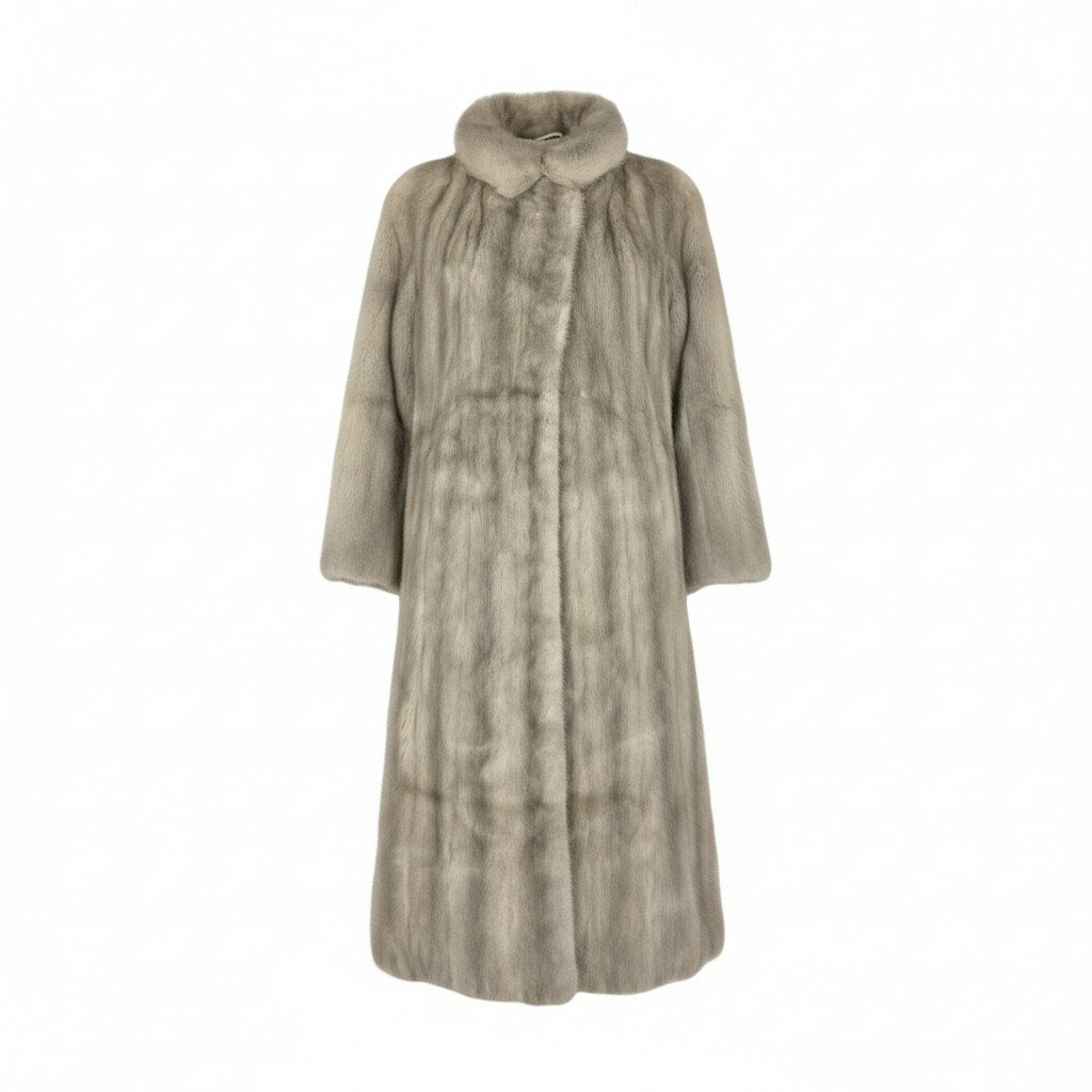 上品なシルバーグレーのサファイアミンクを使用した、存在感のある超ロング丈毛皮コートです。素材は毛足が細かく滑らかな高級ミンクで、落ち着いた光沢と柔らかな質感が魅力です。全体は縦ラインを意識した無地構成で、スタイルをすっきりと見せてくれます。ドレススタイルやきれいめコーデはもちろん、冬の特別なお出かけや式典シーンにも映える一着です。