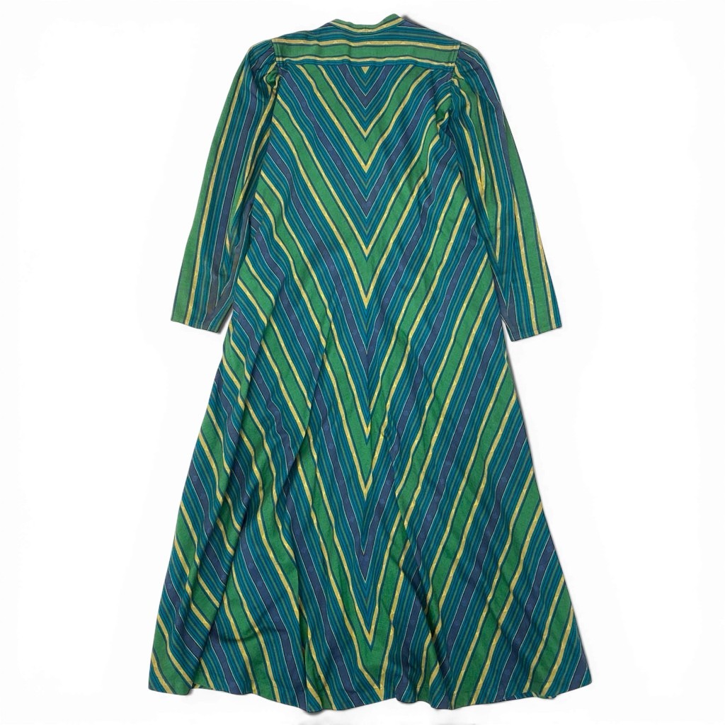 KENZOのヴィンテージガウンコートです。色味はディープグリーン、ブルー、イエローを基調としたマルチカラーストライプ柄で、縦ラインが印象的なデザイン。素材はマットな質感のコットン100%で、軽やかさとナチュラルな風合いを兼ね備えています。カシュクール仕様により羽織り・ワンピース両用で、日常使いからリゾート、旅行シーンまで幅広く活躍する一着です。