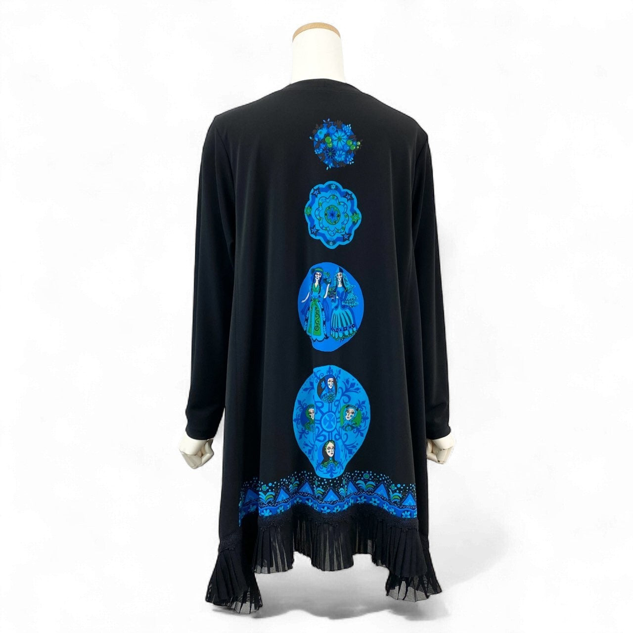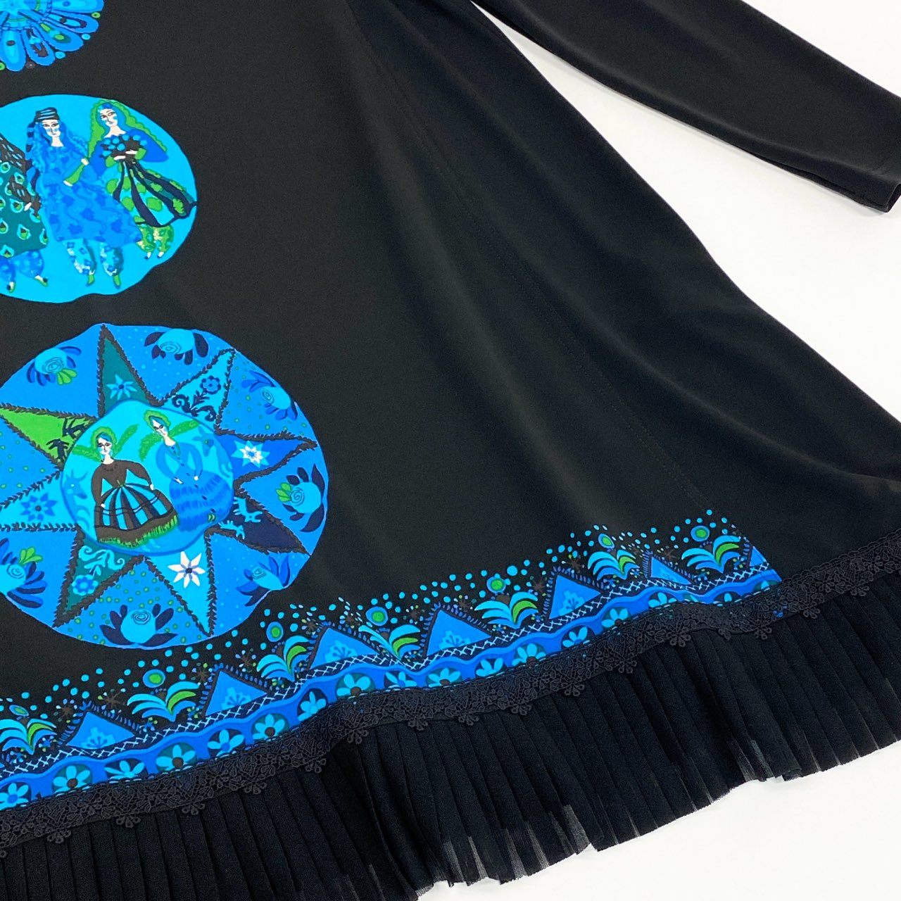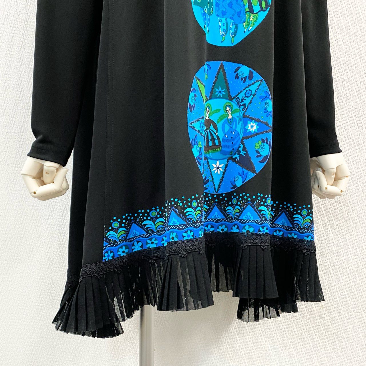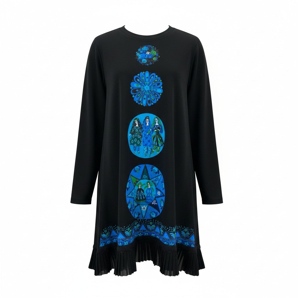 ブラックをベースに、鮮やかなブルー系の円形アートプリントを縦に連ねた、TOKUKO 1er VOL らしい独創的なデザインの長袖ワンピースチュニックです。裾には細かなプリーツを施し、動いた際にふわりと揺れるエレガントな表情をプラス。マットで柔らかな素材が身体のラインを拾いにくく、一枚で存在感のあるスタイルが完成します。お出かけやイベントはもちろん、デイリーの華やぎコーデにも活躍するアイテムです。