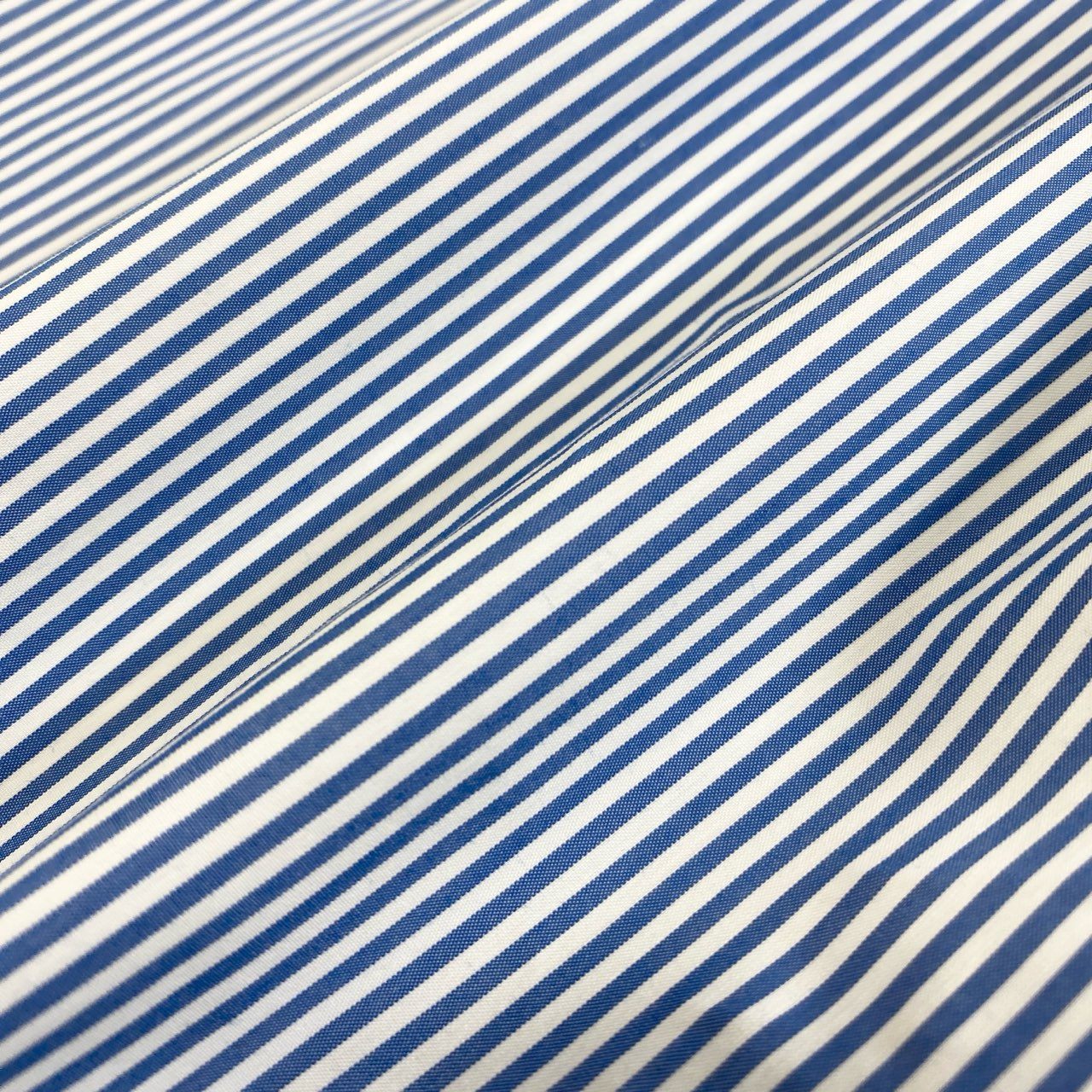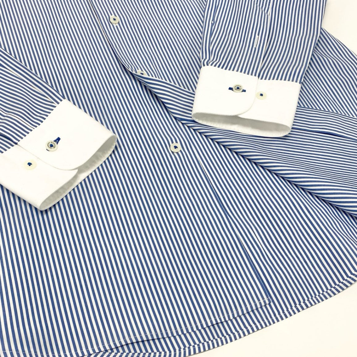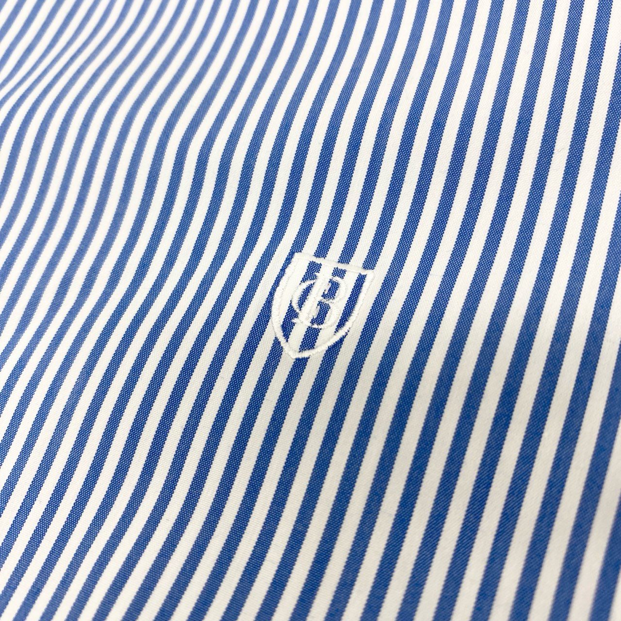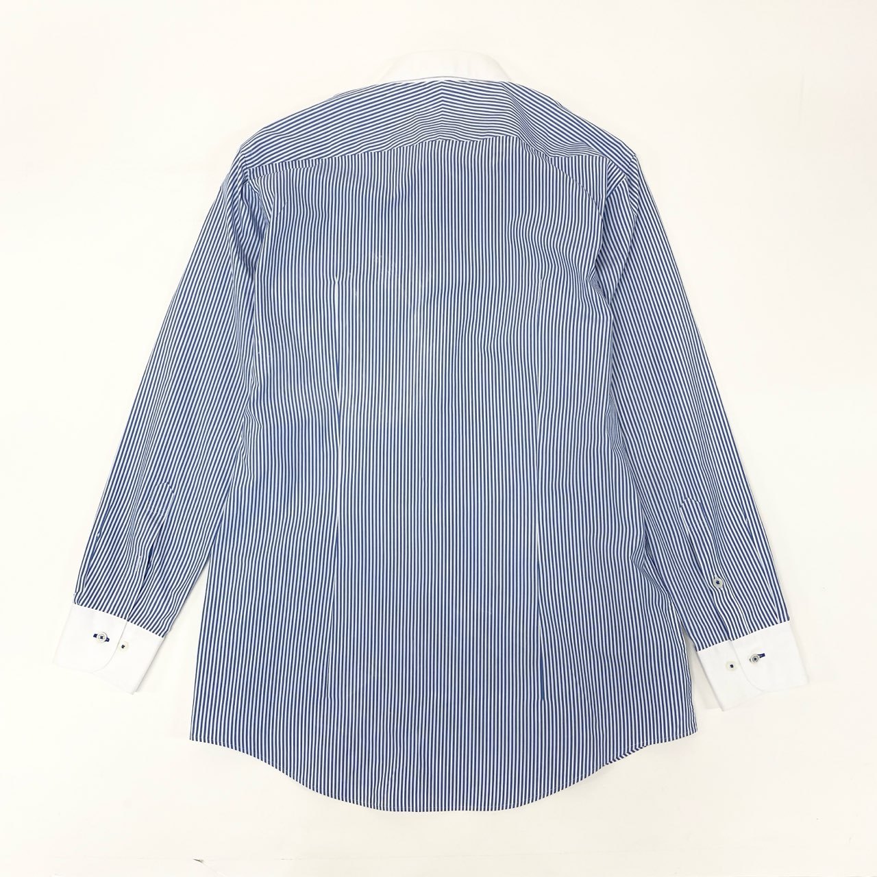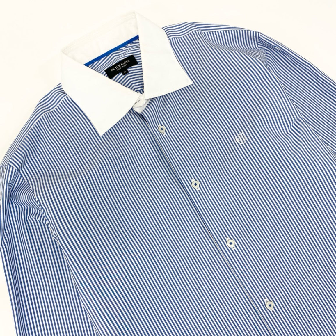 ブラックレーベル クレストブリッジのストライプシャツ。ブルー×ホワイトの細ピッチストライプに、ホワイトのワイドカラーとカフスを組み合わせたクレリックデザインが洗練された印象を与えます。マットな質感の高密度コットン地が上品で、胸元にはブランドの刺繍ロゴを控えめに配置。ビジネススタイルからセミフォーマルまで幅広く対応し、ジャケットインでも一枚でも映えるエレガントな一着です。
