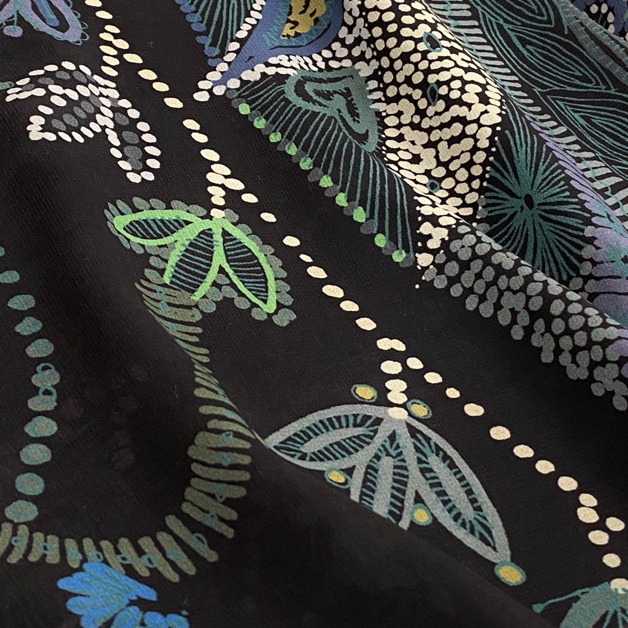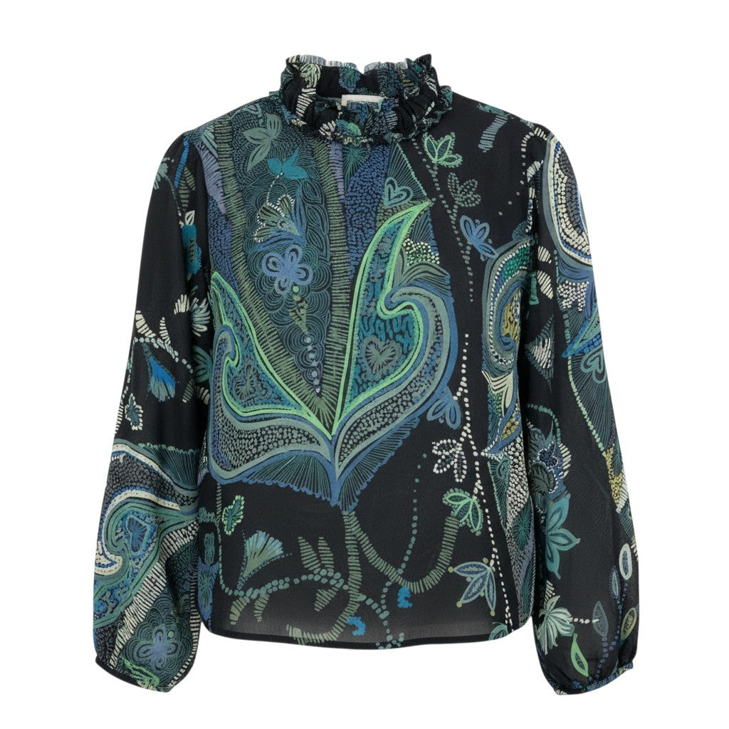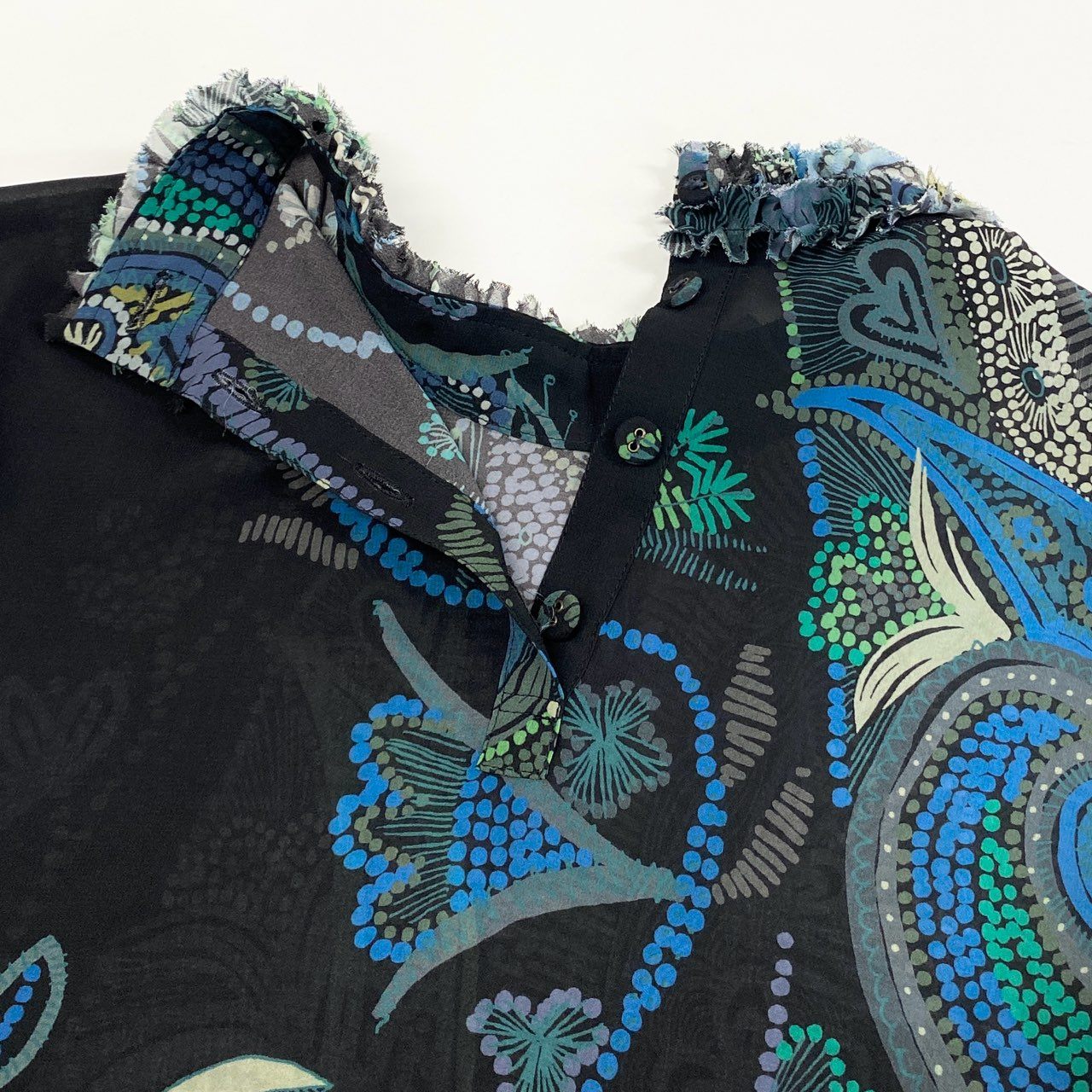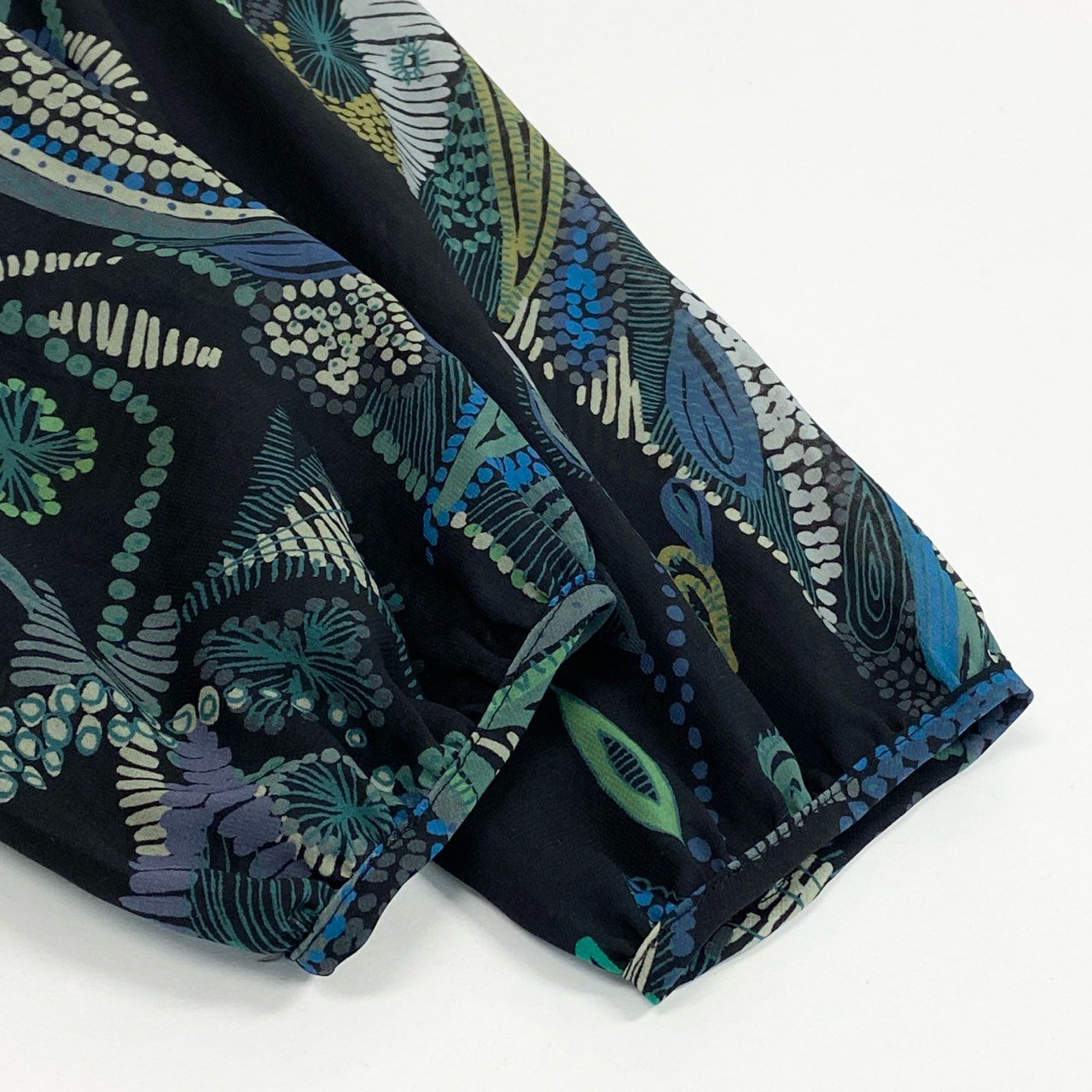 ブラックベースに、ブルー〜グリーン系のアートフラワー&ペイズリー調プリント が華やかに映える、トクコプルミエヴォルらしい存在感あるシアーブラウスです。軽やかなポリエステル素材で透け感があり、レイヤード次第で季節を問わず長く楽しめます。フリルネックが上品なアクセントとなり、1枚で華やかな印象に。スカート・パンツどちらにも合わせやすく、普段使いからお出かけ、アートイベントにもぴったりのアイテムです。