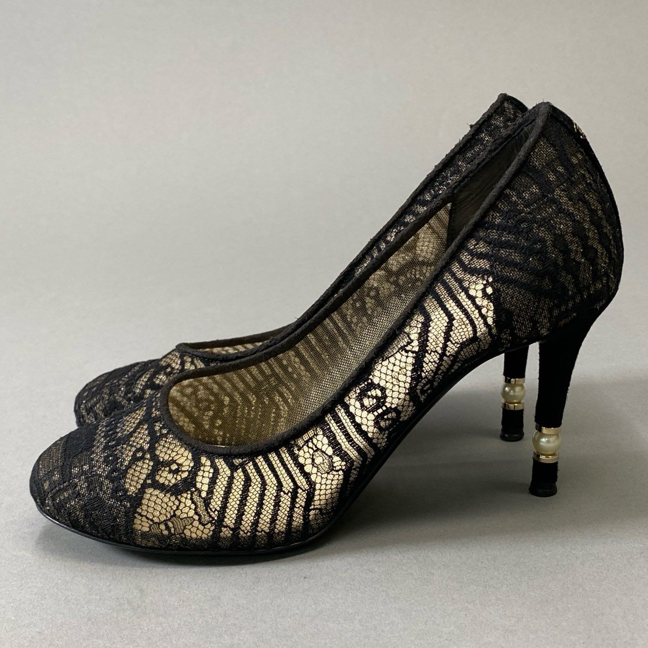 CHANELのレディースレースパンプスです。写真からはベージュ地にブラックレースを重ねたエレガントなカラーリングが確認でき、繊細な花柄レースが女性らしい雰囲気を演出しています。ヒール部分には上品なココマーク入りパール装飾があしらわれ、足元にラグジュアリーなアクセントをプラス。8cmヒールで美しい脚線を演出しつつも、エレガントでクラシカルな印象を与えます。特別なパーティーやフォーマルな場面にふさわしい一足です。